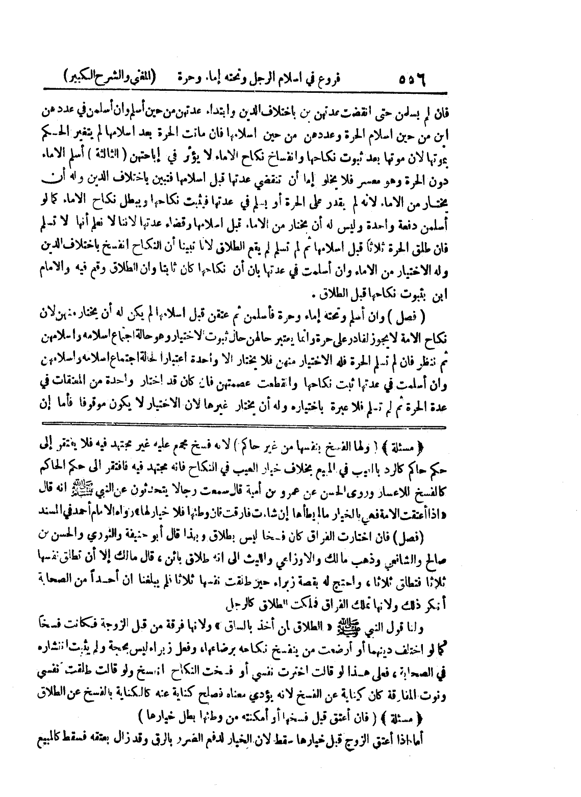 (مسألة) (ولها الفسخ بنفسها من غير حاكم) لأنه فسخ مجمع عليه غير مجتهد فيه فلا يفتقر إلى حكم حاكم كالرد بالعيب في المبيع بخلاف خيار العيب في النكاح فإنه مجتهد فيه فافتقر إلى حكم الحاكم كالفسخ للاعسار وروى الحسن عن عمرو بن أمية قال سمعت رجالا يتحدثون عن النبي صلى الله عليه وسلم أنه قال (إذا أعتقت الأمة فهي بالخيار ما ايطاها إن شاءت فارقت فإن وطئها فلا خيار لها) رواه الامام أحدم في السند (فصل) فإن اختارت الفراق كان فسخاً ليس بطلاق وبهذا قال أبو حنيفة والثوري والحسن بن صالح والشافعي وذهب مالك والاوزاعي والليث إلى أنه طلاق بائن، قال مالك إلا أن تطلق نفسها