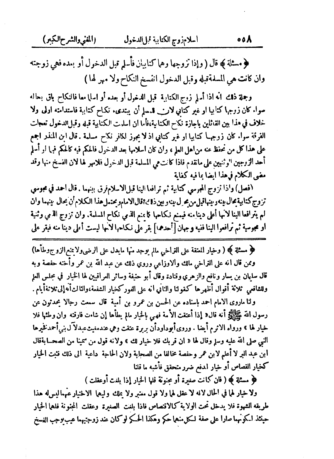وروى أبو داود أن بريرة عتقت وهي عنده مغيب عبد لآل بني أحمد فحيرها النبي صلى الله عليه وسلم وقال لها (ان اقربك فلا خيار لك) ولأنه قول من سمينا من الصحابة قال ابن عبد البرلا أعلم لابن عمر وحفصة مخالفاً من الصحابة ولأن الحاجة داعية إلى ذلك فثبت الخيار كخيار القصاص أو خيار لدفع ضرر متحقق فأشبه ما قلنا (مسألة) (فإن كانت صغيرة أو مجنونة فلها الخيار إذا بلغت أو عقلت) ولا خيار لهما في الحال لأنه لا عقل لهما ولا قول معتبر ولا يملك وليهما الاختيار ععنهما ليس له هذا طريقه الشهوة فلا يدخل تحت الولاية كالاقتصاص فإذا بلغت الصغيرة وعقلت المجنونة فلهما الخيار حينئذ لكونهما صارا على صفة لكل منهما حكم وهكذا الحكم لو كان عند زوجيتهما عيث بوجب الفسخ