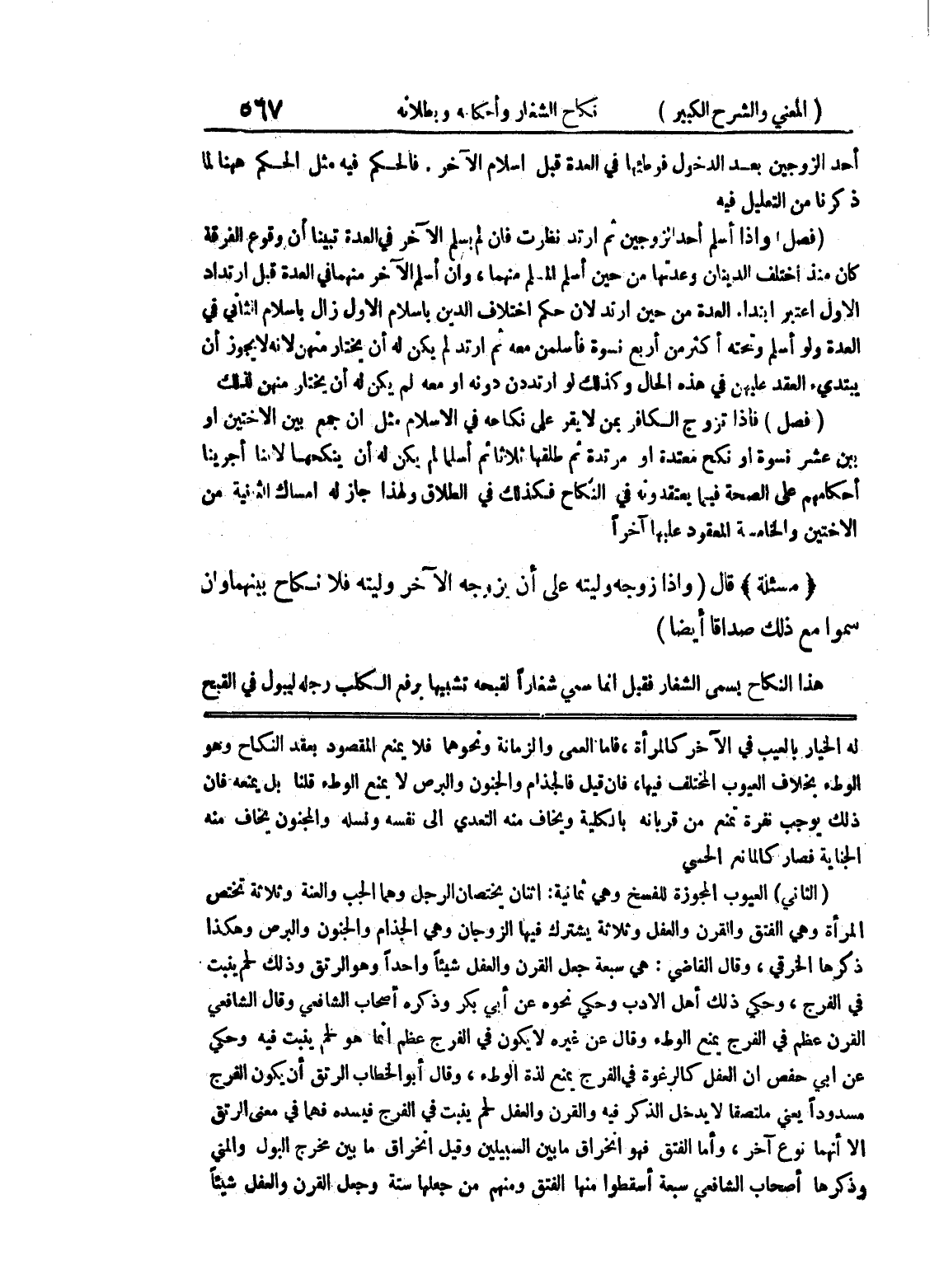 له الخيار بالعيب في الآخر كالمرأة، فأما العمى والزمانة ونحوهما فلا يمنع المقصود بعقد النكاح وهو الوطئ بخلاف العيوب المختلف فيها، فان قيل فالجذام والجنون والبرص لا يمنع الوطئ قلنا بل يمنعه فإن ذلك يوجب نفرة تمنع من قربانه بالكلية ويخاف منه التعدي إلى نفسه ونسله والمجنون يخاف منه الجناية فصار كالمانع الحمي (الثاني) العيوب المجوزة للفسخ وهي ثمانية: اثنان يختصان الرجل وهما الجب والعنة وثلاثة تختص المرأة وهي الفتق والقرن والعفل وثلاثة يشترك فيها الزوجان وهي الجذام والجنون والبرص وهكذا ذكرها الخرقي، وقال القاضي: هي سبعة جعل القرن والعفل شيئاً واحداً وهو الرتق وذلك لحم ينبت في الفرج، حكي ذلك أهل الأدب وحكي نحوه عن ابي بكر وذكره أصحاب الشافعي وقال الشافعي القرن عظم في الفرج يمنع الوطئ وقال عن غيره لا يكون في الفرج عظم إنما هو لحم ينبت فيه وحكي عن أبي حفص أن العفل كالرغوة في الفرج يمنع لذة الوطئ، وقال أبو الخطاب الرتق أن يكون الفرج مسدوداً يعني ملتصفا لا يدخل الذكر فيه والقرن والعقل لحم ينبت في الفرج فيسده فهما في معنى الرتق إلا أنهما نوع آخر، وأما الفتق فهو انخراق ما بين السبيلين وقيل انخراق ما بين مخرج البول والمني وذكرها أصحاب الشافعي سبعة أسقطوا منها الفتق ومنهم من جعلها ستة وجعل القرن والعفل شيئاً