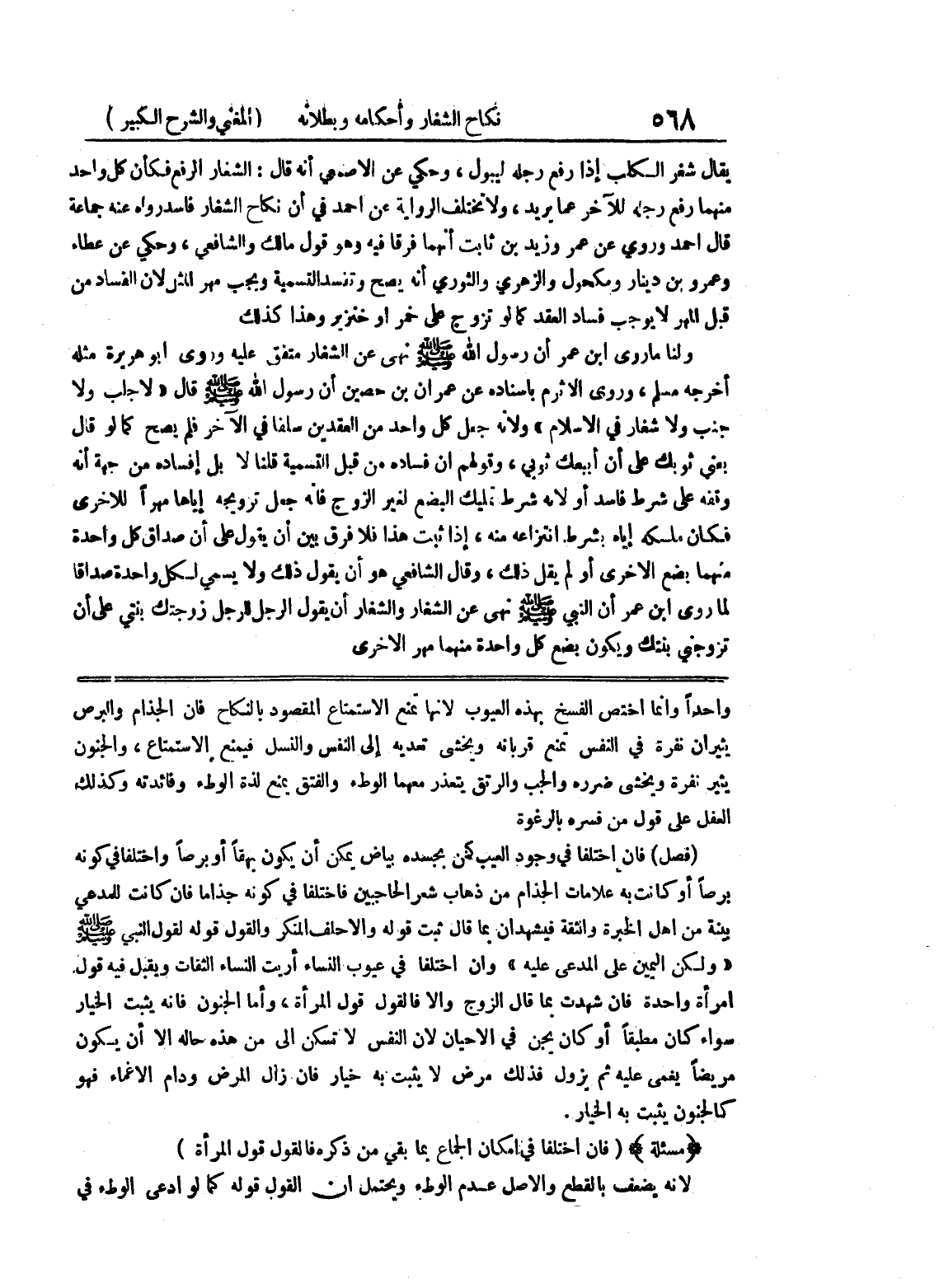 واحداً وإنما اختص الفسخ بهذه العيوب لأنها تمنع الاستمتاع المقصود بالنكاح فإن الجذام والبرص يثيران نفرة في النفس تمنع قربانه ويخشى تعديه إلى النفس والنسل فيمنع الاستمتاع، والجنون يثير نفرة ويخشى ضرره والجب والرتق بتعذر معهما الوطئ والفتق يمنع لذة الوطئ وفائدته وكذلك العفل على قول من فسره بالرغوة (فصل) فإن اختلفا في وجود العيب كمن يجسده بياض يمكن أن يكون بهقاً أو برصاً واختلفا في كونه برصاً أو كانت به علامات الجذام من ذهاب شعر الحاجبين فاختلفا في كونه جذاماً فإن كانت للمدعي بينة من أهل الخبرة والثقة فيشهدان بما قال ثبت قوله والاحلف المنكر والقول لقول النبي صلى الله عليه وسلم