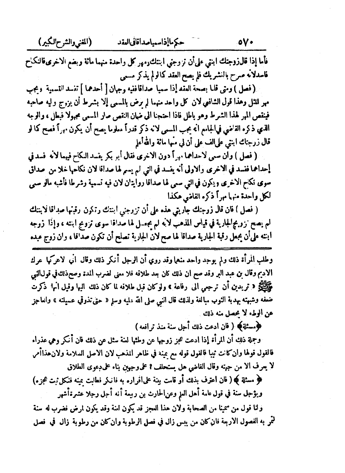 وطلب المرأة ذلك ولم يوجد واحد منهما وقد روي أن الرجل وقال إني لأعركها عرك الأديم وقال بن عبد البر وقد صح أن ذلك كان بعد طلاقه فلا معنى لضرب المدة وصح ذلك في قول النبي صلى الله عليه وسلم (تريدين أن ترجعي إلى رفاعة) ولو كان قبل طلاقه لما كان ذلك إليها وقيل أنها ذكرت ضعفه وشبهته بهدبة الثوب مبالغة ولذلك قال النبي صلى الله عليه وسلم (حتى تذوقي عسيلته) والعاجز عن الوطئ لا يحصل منه ذلك (مسألة) (فإن ادعت ذلك أجل سنة منذ ترافعه) وجملة ذلك أن المرأة إذا ادعت عجز زوجها عن وطئها لعنة سئل عن ذلك فإن أنكر وهي عذراء فالقول قولها وإن كانت ثيباً فالقول قوله مع يمينه في ظاهر المذهب لأن الأصل السلامة ولأن هذا أمر لا يعرف إلا من جهته وقال القاضي هل يستحلف؟ على وجهين بناء على دعوى الطلاق (مسألة) (فإن اعترف بذلك أو قامت بينة على إقراره به فأنكر فطلبت يمينه فنكل ثبت عجزه) ويؤجل سنة في قول عامة أهل العلم وعن الحارث بن ربيععة أنه أجل رجلا عشرة أشهر ولنا قول من سمينا من الصحابة ولأن هذا العجز قد يكون لعنة وقد يكون لمرض فضرب له سنة لتمر به الفصول الأربعة فإن كان من يبس زال في فصل الرطوبة وإن كان من رطوبة زال في فصل