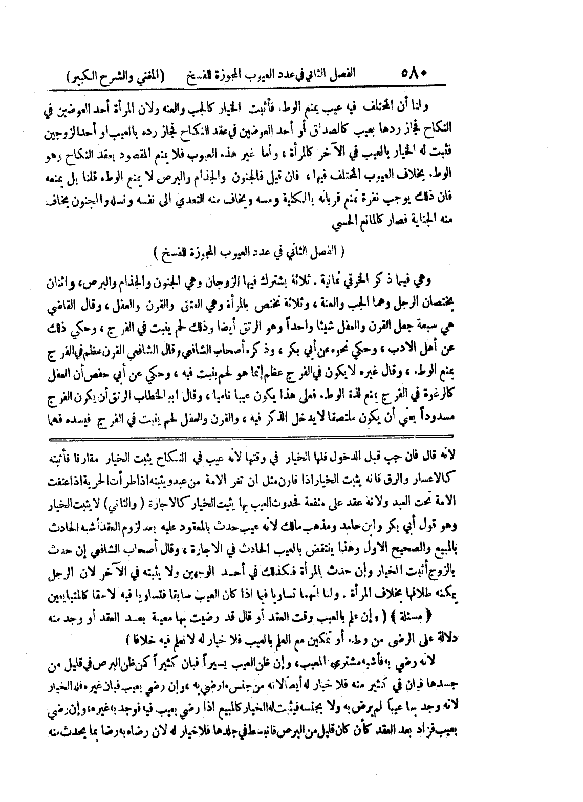 لأنه قال فإن جب قبل الدخول فلها الخيار في وقتها لأنه عيب في النكاح يثبت الخيار مقارناً فأثبته كالإعسار والرق فإنه يثبت الخيار إذا قارن مثل أن تغز الأمة من عبد ويثبته إذا طرأت الحرية إذا عتقت الأمة تحت العبد ولأنه عقد على منفعة فحدوث العيب بها يثبت الخيار كالاجاة (والثاني) لا يثبت الخيار وهو قول أبي بكر وابن حامد ومذهب مالك لأنه عيب حدث بالمعقود عليه بعد لزوم العقد أشبه الحادث بالمبيع والصحيح الأول وهذا ينتقض بالعيب الحادث في الإجارة، وقال أصحاب الشافعي إن حدث بالزوج أثبت الخيار وإن حدث بالمرأة فكذلك في أحسد الوجهين ولا يثبته في الآخر لأن الرجل يمكنه طلاقها بخلاف المرأة.