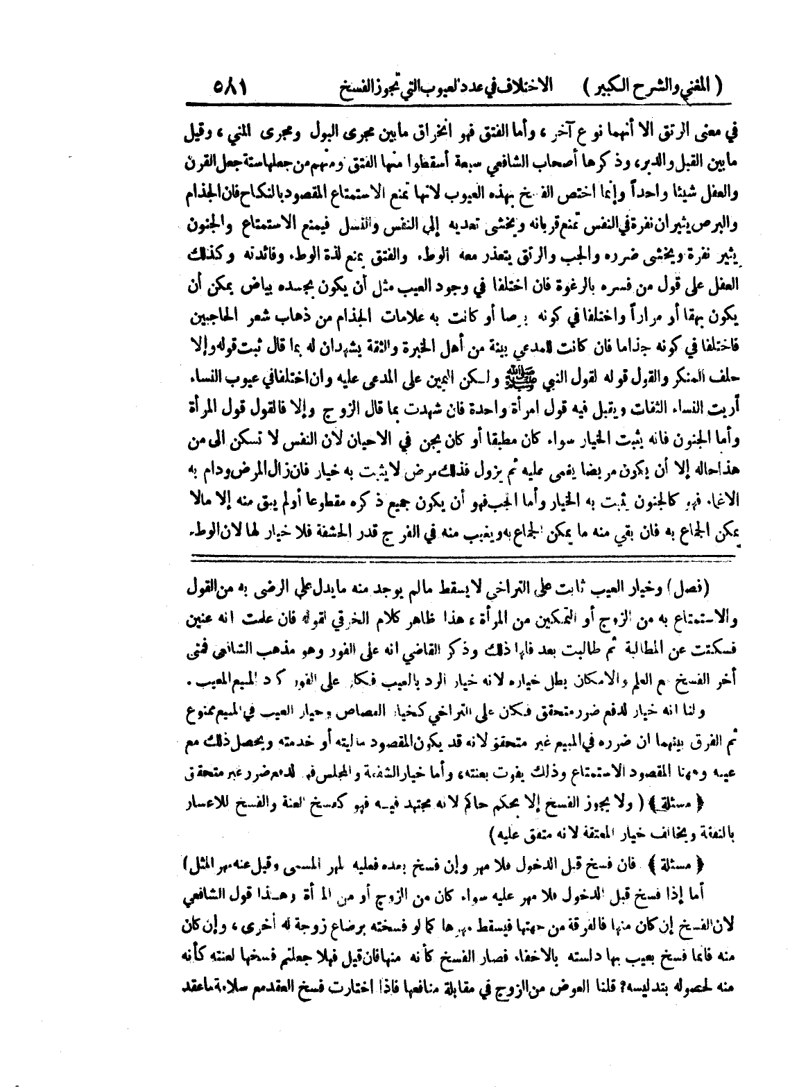 (فصل) وخيار العيب ثابت على التراخي لا يسقط ما لم يوجد منه ما يدل على الرضي به من القول والاستمتاع به من الزوج أو التمكين من المرأة، هذا ظاهر كلام الخرقي لقوله فإن علمت أنه عنين فسكتت عن المطالبة ثم طالبت بعد فلها ذلك وذكر القاضي أنه على الفور وهو مذهب الشافعي فمتى أخر الفسخ مع العلم والإمكان بطل خياره لأنه خيار الرد بالعيب فكار على الفور كاد المبيع المعيب ولنا أنه خيار لدفع ضرر متحقق فكان على التراخي كخياء القصاص وخيار العيب في المبيع ممنوع ثم الفرق بينهما أن ضرره في المبيع غير متحقق لأنه قد يكون المقصود ماليته أو خدمته ويحصل ذلك مع عيبه وههنا المقصود الاستمتاع وذلك يفوت بعنته، وأما خيار الشفعة والمجلس فهو لدمع ضرر عبر متحقق (مسألة) (ولا يجوز الفسخ إلا بحكم حاكم لأنه مجتهد فيه فهو كفسخ العنة والفسخ للاعسار يالنفقة ويخالف خيار المعتقة لأنه متفق عليه) (مسألة) فإن فسخ قبل الدخول فلا مهر وإن فسخ بعده فعليه لمهر المسمى وقبل عنه مهر المثل) أما إذا فسخ قبل الدخول فلا مهر عليه سواء كان من الزوج أو من المرأة وهذا قال الشافعي لأن الفسخ إن ان منها فالفرقة من جهتها فيسقط مهرها كما لو فسخته برضاع زوجة له أخرى، وإن كان منه فإنما فسخ بعيب بها دلسته بالإخفاء فصار الفسخ كأنه منها فإن قيل فهلا جعلتم فسخها لعنته كأنه منه لحصوله بتد ليسه؟ قلنا العوض من الزوج في مقابلة منافعها فإذا اختارت فسخ العقد مع سلامة ما عقد