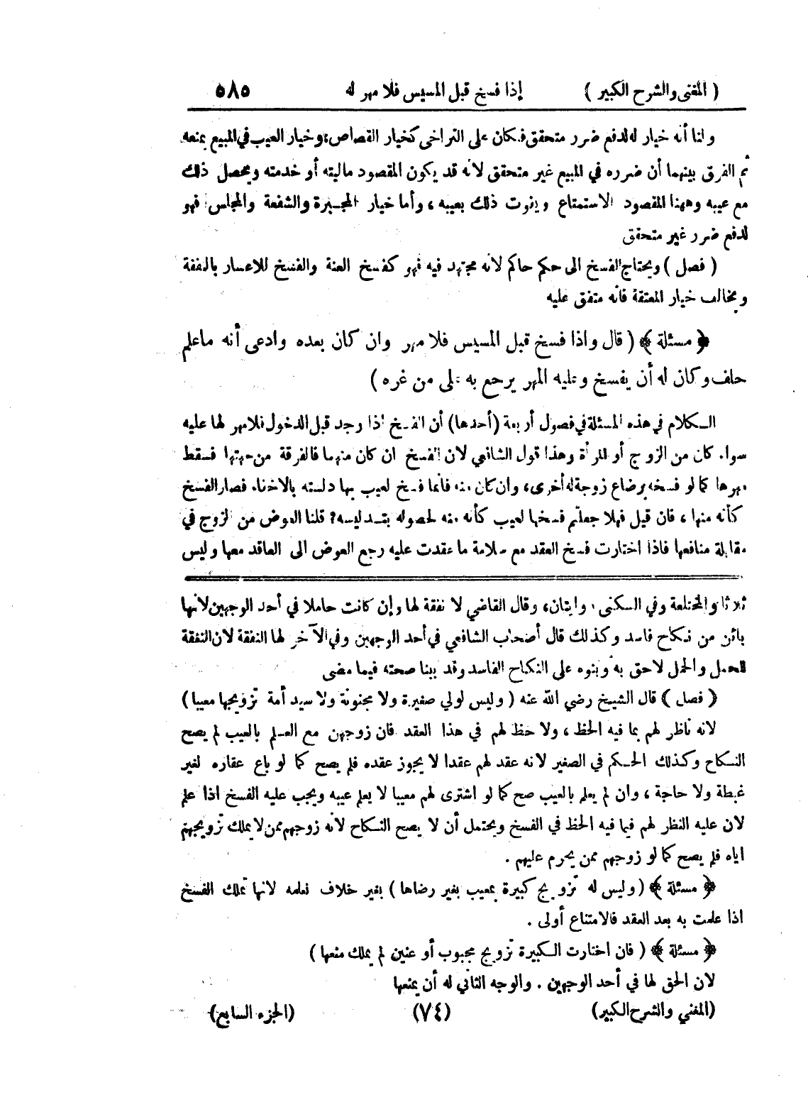للحمل والحمل لاحق به وبنوه على النكاح الفاسد وقد بينا صحته فيما مضى (فصل) قال الشيخ رضي الله عنه (وليس لولي صغيرة ولا مجنونة ولا سيد أمة تزويجها معيبا) لأنه ناظر لهم بما فيه الحظ، ولا حظ لهم في هذا العقد فإن زوجهن مع العلم بالعيب لم يصح النكاح وكذلك الحكم في الصغير لأنه عقد لهم عقداً لا يجوز عقده فلم يصح كما لو باع عقاره لغير غبطة ولا حاجة، وإن لم يعلم بالعيب صح كما لو اشترى لهم معيباً لا يعلم عيبه ويجب عليه الفسخ إذا علم لانع عليه النظر لهم فيه الحظ في الفسخ ويحتمل أن لا يصح النكاح لأنه زوجهم ممن لا يملك تزويجهم إياه فلم يصح كما لو زوجهم ممن يحرم عليهم (مسألة) (وليس له تزويج كبيرة بمعيب بغير رضاها) بغير خلاف نعلمه لأنها تملك الفسخ إذا علمت به بعد العقد فالامتناع أولى (مسألة) (فإن اختارات الكبيرة تزويج مجبوب أو عنين لم يملك منعها) لأن الحق لها في أحد الوجهين.