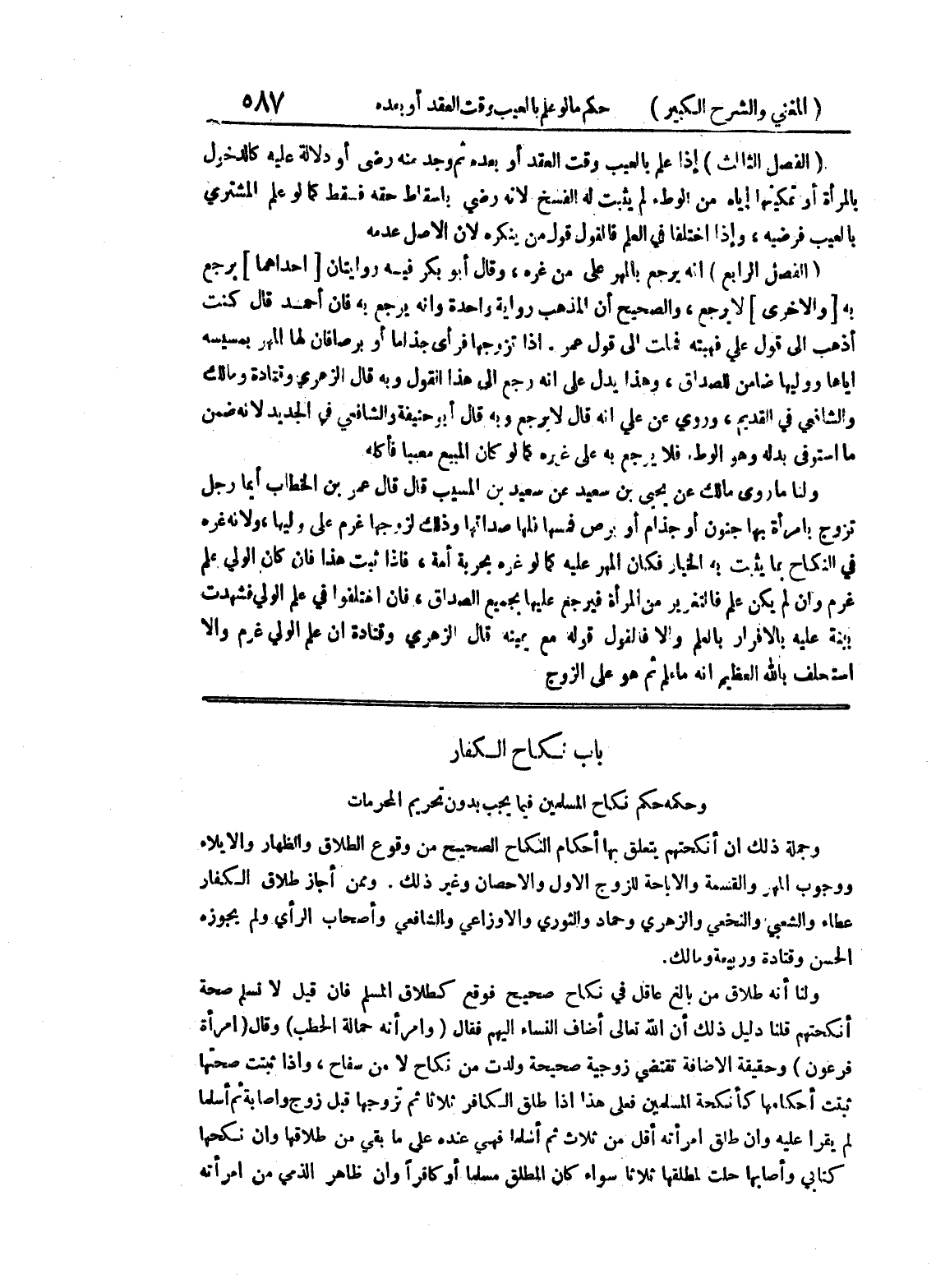 باب نكاح الكفار وحكه حكم نكاح المسلمين فيما يجب بدون تحريم المحرمات وجملة ذلك أن أنكحتهم يتعلق بها أحكام النكاح الصحيح من وقوع الطلاق والظهار والإيلاء ووجوب المهر والقسمة والإباحة للزوج الأول والإحصان وغير ذلك.