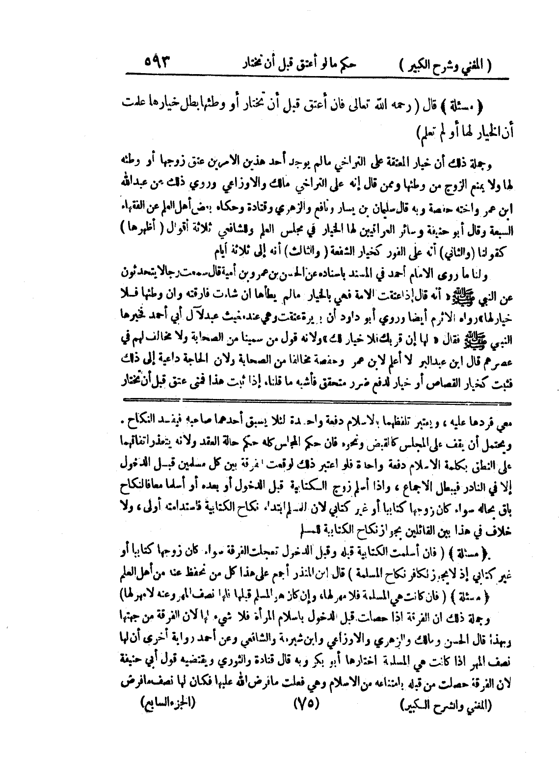 ويحتمل أن يقف على المجلس كالقبض ونحوه فإن حكم المجلس كله حكم حالة العقد ولأنه يتعذر اتفاقهما على النطق بكلمة الإسلام دفعة واحدة فلو اعتبر ذلك لوقعت الفرقة بين كل مسلمين قبل الدخول إلا في النادر فيبطل الإجماع، وإذا أسلم زوج الكتابية قبل الدخول أو بعده أسلما معافا لنكاح باق بحاله سواء كان زوجها كتابياً أو غير كتابي لأن للمسلم ابتداء نكاح الكتابية فاستدامته أولى، ولا خلاف في هذا بين القائلين بجواز نكاح الكتابية للمسلم (مسألة) (فإن أسلمت الكتابية قبله وقبل الدخول تعجلت الفرقة سواء كان زوجها كتابياً أو غير كتابي إذ لا يجوز لكافر نكاح المسلمة) قال إبن المنذر أجمع على هذا كل من تحفظ عنه من أهل العلم (مسألة) (فان كات هي المسلمة فلا مهر لها، وإن كان هو المسلم قبلها فلها نصف المهر وعنه لا مهر لها) وجملة ذلك أن الفرقة إذا حصلت قبل الدخول بإسلام المرأة فلا شئ لها لأن الفرقة من جهتها وبهذا قال الحسن ومالك والزهري والاوزاعي وابن شبرمة والشافعي وعن أحمد رواية أخرى أن لها نصف المهر إذا كانت هي المسلمة اختارها أبو بكر وبه قال قتادة والثوري ويقتضيه قول أبي حنيفة لأن الفرقة حصلت من قبله بامتناعه من الإسلام وهي فعلت ما فرض الله عليها فكان لها نصف ما فرض