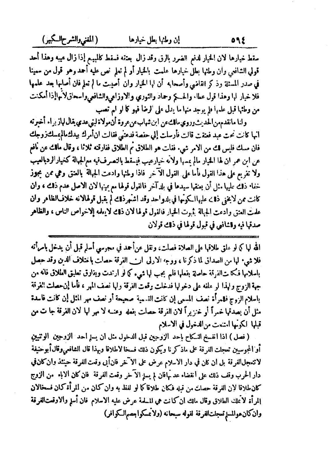 الله لها كما لو علق طلاقها على الصلاة فصلت، ونقل عن أحمد في مجوسي أسلم قبل أن يدخل بامرأته فلا شئ لها من الصداق لما ذكرنا، ووجه الأولى أن الفرقة حصلت باختلاف الدين وقد حصل بإسلامها فكانت الفرق حاصلة بفلها فلم يجب لها شئ كما لو ارتدت ويفارق تعليق الطلاف فإنه من جهة الزج ولهذا لو علقه على دخولها فدخلت وقعت الفرقة ولها نصف المهر، فأما إن حصلت الفرقة بإسلام الزوج فللمرأة نصف المسمى إن كانت التسمية صحيحة أو نصف مهر المثل إن كانت فاسدة مثل أن يصدقها خمراً أو خنزيراً لأن الفرقة حصلت بفعله وعنه لا مهر لها لأن الفرقة جاءت من قلها لكونها امتنعت من الدخول في الإسلام (فصل) إذا انفسخ النكاح بأحد الزوجين قبل الدخول مثل أن يسلم أحد الزوجين الوثنيين أو المجوسيين تعجلت الفرقة على ما ذكرنا ويكون ذلك فسخا لا طلاقاً وبهذا قال الشافعي وقال أبو حنيفة لا تتعجل الفرقة بل إن كان في دار الإسلام عرض على الآخر فإن أبى وقعت الفرقة حينئذ وإن كان في دار الحرب وقف ذلك على انقضاء عدتها فإن لم يسلم الآخر وقعت الفرقة فإن كان الاباء من الزوج كان طلاقا لأن الفرقة حصلت من قبله فكان طلاقا كما لو لفظ به وإن كان من المرأة كان فسخا لأن المرأة لا تملك الطلاق وقال مالك إن كانت هي المسلمة عرض عليه الإسلام فإن أسلم وإلا وقعت الفرقة وإن كان هو المسلم تعجلت الفرقة لقوله سبحانه (ولا تمسكوا بعصم الكوافر)