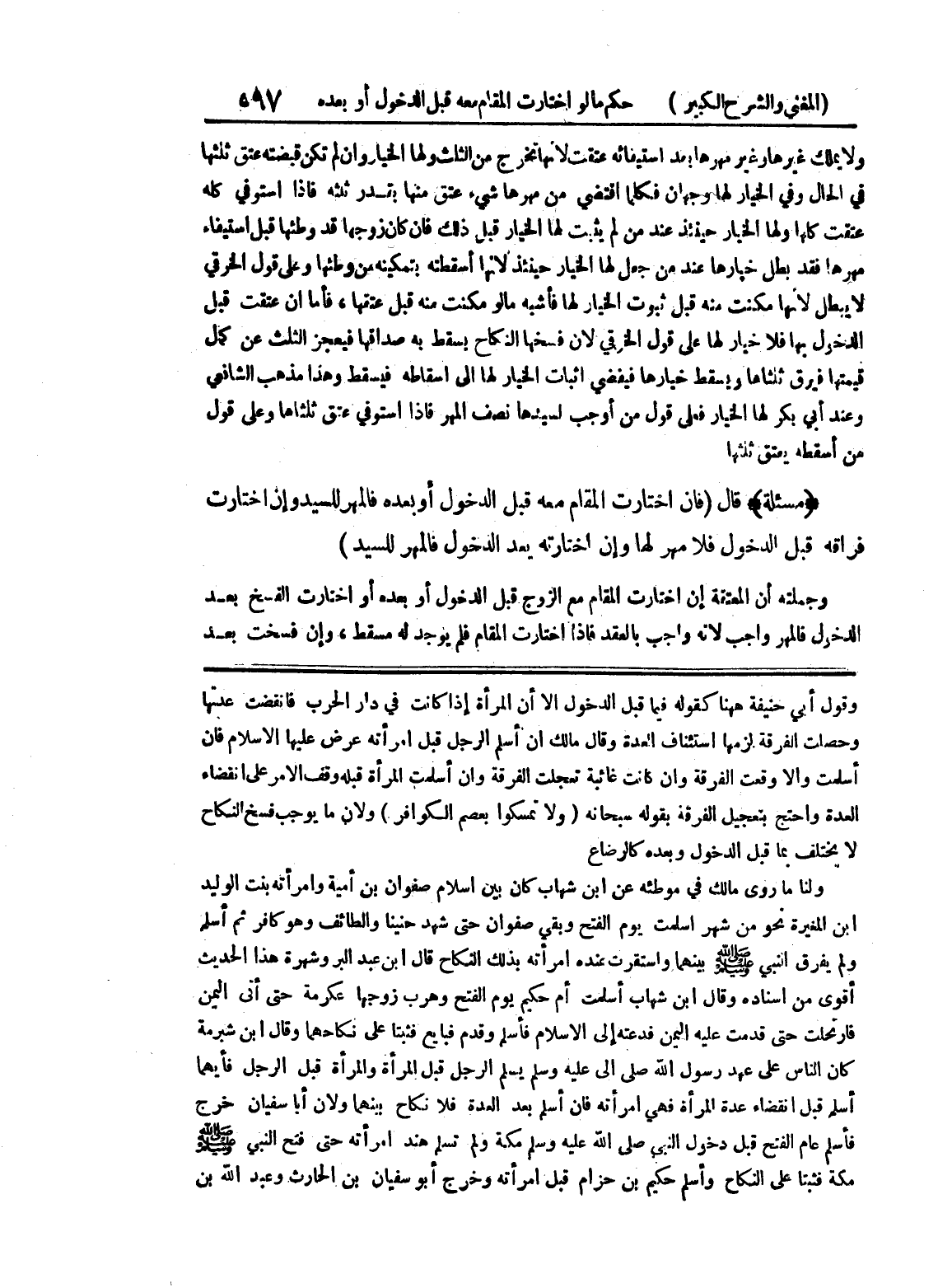 وقول أبي حنيفة ههنا كقوله فيما قبل الدخول إلا أن المرأة إذا كانت في دار الحرب فانقضت عدتها وحصلت الفرقة لزمها استئناف العدة وقال مالك إن أسلم الرجل قبل امرأته عرض عليها الإسلام فإن أسلمت وإلا وقعت الفرقة وإن كانت غائبة تعجلت الفرقة وإن أسلمت المرأة قبله وقف الأمر على انقضاء العدة واحتج بتعجيل الفرقة بقوله سبحانه (ولا تمسكوا بعصم الكوافر) ولأن ما يوجب فسخ النكاح لا يختلف بما قبل الدخول وبعده كالرضاع ولنا ما روى مالك في موطئه عن ابن شهاب كان بين إسلام صفوان بن أمية وامرأته بنت الوليد ابن المغيرة نحو من شهر أسلمت يوم الفتح وبقي صفوان حتى شهد حنينا والطائف وهو كافر ثم أسلم ولم يفرق النبي صلى الله عليه وسلم بينهما واستقرت عنده امرأته بذلك النكاح قال ابن عبد البر وشهرة هذا الحديث أقوى من إسناده وقال ابن شهاب أسلمت أم حكيم يوم الفتح وهرب زوجها عكرمة حتى أتى اليمن فارتحلت حتى قدمت عليه اليمن فدعته إلى الإسلام فأسلم وقدم فبايع فثبتا على نكاحهما وقا ابن شبرمة كان الناس على عهد رسول الله صلى الله عليه وسلم يسلم الرجل قبل المرأة والمرأة قبل الرجل فأيهما أسلم قبل انقضاء عدة المرأة فهي امرأته فإن أسلم بعد العدة فلا نكاح بينهما ولأن أبا سفيان خرج فأسلم عام الفتح قبل دخول النبي صلى الله عليه وسلم مكة ولم تسلم هند امرأته حتى فتح النبي صلى الله عليه وسلم مكة فثبتا على النكاح وأسلم حكيم بن حزام قبل امرأته وخرج أبو سفيان بن الحارث وعبد الله بن