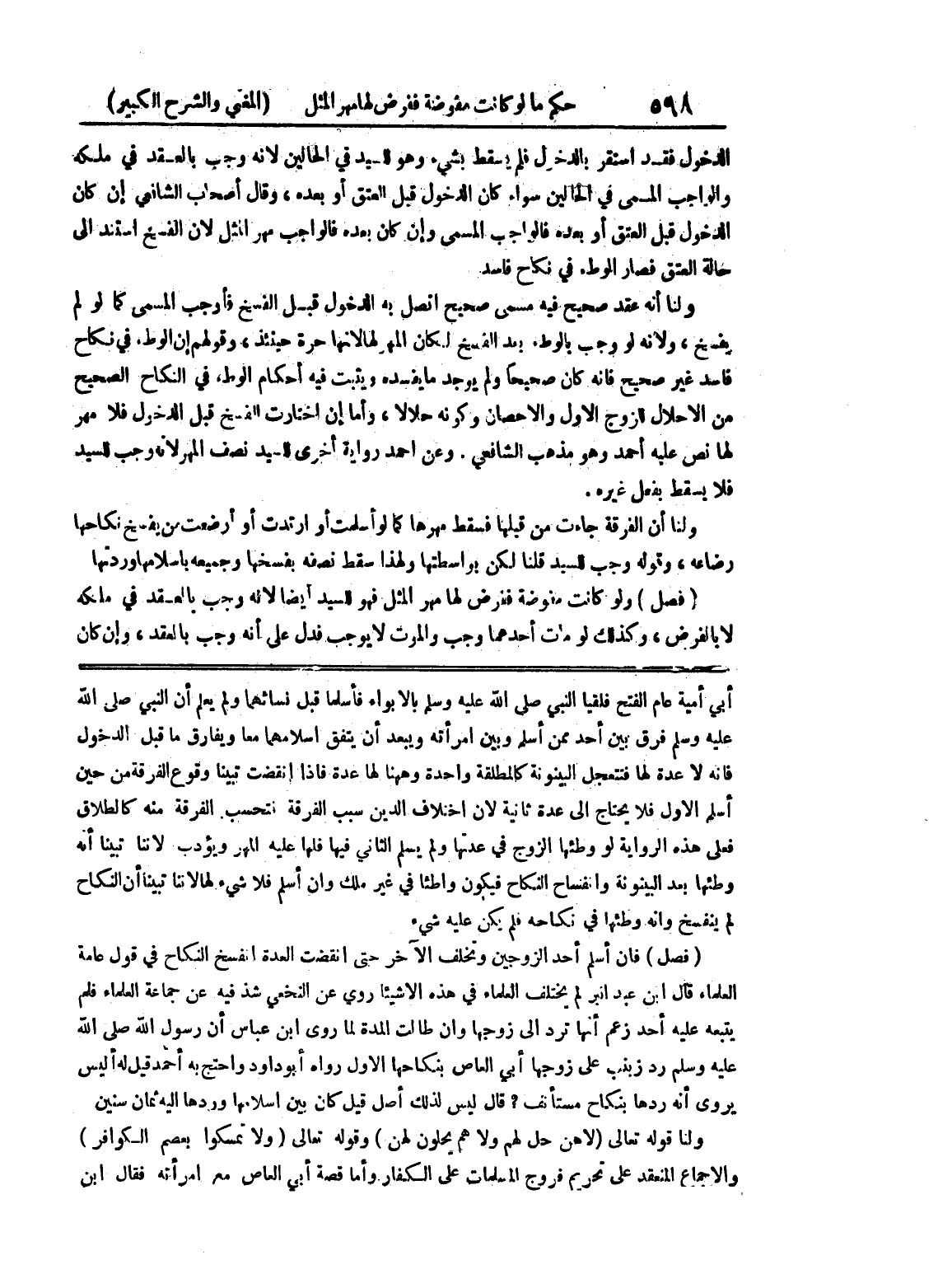 لم ينفسخ وأنه وطئها في نكاحه فلم يكن عليه شئ (فصل) فان أسلم أحد الزوجين وتخلف الآخر حتى انقضت العدة انفسخ النكاح في قول عامة العلماء قال ابن عبد البر لم يختلف العلماء في هذه الأشياء روي عن النخعي شذ فيه عن جماعة العلماء فلم يتبعه عليه أحمد زعم أنها ترد إلى زوجها وإن طالت المدة لما روى ابن عباس أن رسول الله صلى الله عليه وسلم رد زينب على زوجها أبي العاص بنكاحها الأول رواه أبودادو واحتج به أحمد قيل له أليس يروى أنه ردها بنكاح مستأنف؟ قال ليس لذك أصل قيل كان بين إسلامها وردها إليه ثمان سنين ولنا قوله تعالى (لا هن حل لهم ولا هم يحلون لهن) وقوله تعالى (ولا تمسكوا بعصم الكوافر) والإجماع المنعقد على تحريم فروج المسلمات على الكفار وأما قصة أبي العاص مع امرأته فقال ابن