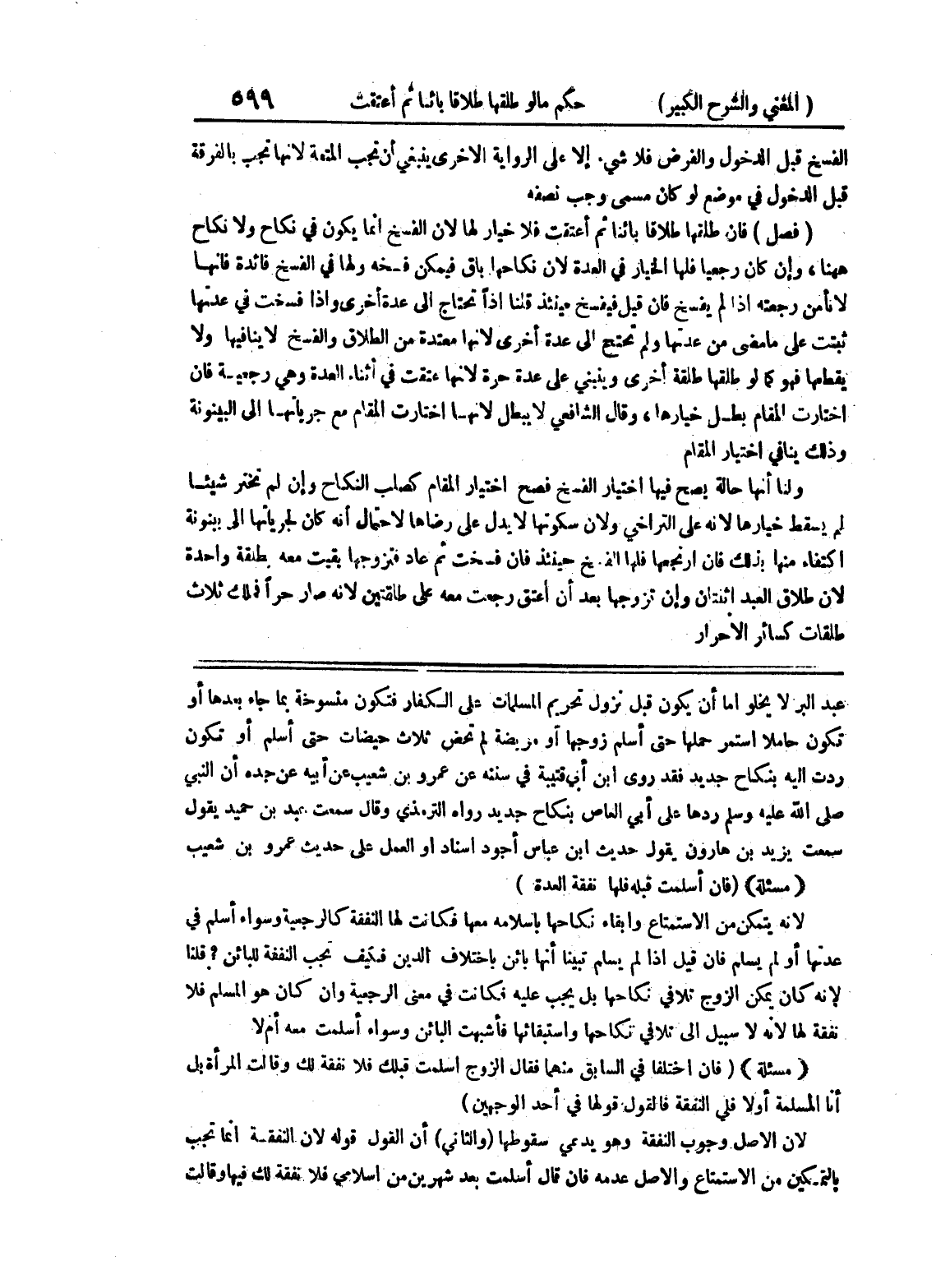 عبد البر لا يخلو إما أن يكون قبل نزول تحريم المسلمات على الكفار فتكون منسوخة بما جاء بعدها أو تكون حاملا استمر حملها حتى أسلم زوجها أو مريضة لم تحض ثلاث حيضات حتى أسلم أو تكون ردت إليه بنكاح جديد فقد روى ابن أبي قتيبة في سننه عن عمرو بن شعيب عن أبيه عن جده أن النبي صلى الله عليه وسلم ردها على أبي العاص بنكاح جديد رواه الترمذي وقال سمعت عبد بن حميد يقول سمعت يزيد بن هارون يقول حديث ابن عباس أجود اسناد أو العمل على حديث عمرو بن شعيب (مسألة) (فإن أسلمت قبله فلها نفقة العدة) لأنه يتمكن من الاستمتاع وإبقاء نكاحها بإسلامه معها فكانت لها النفقة كالرجعية وسواء أسلم في عدتها أو لم يسلم فإن قيل إذا لم يسلم تبينا أنها بائن باختلاف الدين فكيف تجب النفقة للبائن؟ قلنا لأنه كان يمكن الزوج تلافي نكاحها بل يجب عليه فكانت في معنى الرجعية وإن كان هو المسلم فلا نفقة لها لأنه لا سبيل إلى تلافي نكاحها واستبقائها فأشبهت البائن وسواء أسلمت معه أم لا (مسألة) (فإن اختلفا في السابق منهما فقال الزوج أسلمت قبلك فلا نفقة لك وقالت المراة بل أن المسلمة أولا فلي النفقة فالقول قولها في أحد الوجهين) لأن الأصل وجوب النفقة وهو يدعي سقوطها (والثاني) أن القول قوله لأن النفقة إنما تجب