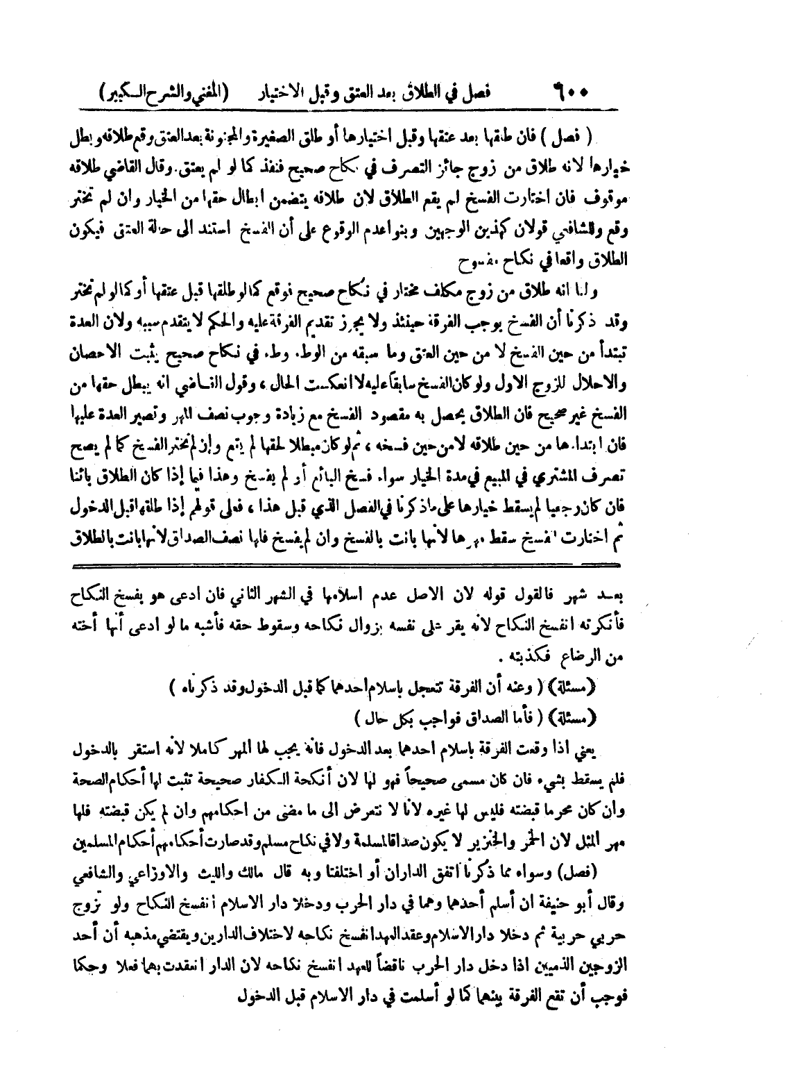 (مسألة) (وعنه أن الفرقة تتعجل باسلام أحدهما كما قبل الدخول وقد ذكرناه) (مسألة) (فأما الصداق فواجب بكل حال) يعني إذا وقعت الفرقة بايسلام أحدهما بعد الدخول فإنه يجب لها المهر كاملا لأنه استقر بالدخول فلم يسقط بشئ فإن كان مسمى صحيحاً فهو لها لأن أنكحة الكفار صحيحة تثبت أحكام الصحة وإن كان محرما قبضته فليس لها غيره لأنا لا نتعرض إلى ما مضى من أحكامهم وإن لم يكن قبضته فلها مهر المثل لأن الخمر والخنزير لا يكون صداقا لمسلمة ولا في نكاح مسلم وقد صارت أحكامهم أحكام المسلمين (فصل) وسواء مما ذكرنا اتفق الداران أو اختلفتا وبه قال مالك والليث والاوزاعي والشافعي وقال أبو حنيفة إن أسلم أحدهما وهما في دار الحرب ودخلا دار الإسلام انفسخ النكاح ولو تزوج حربي حربية ثم دخلا دار الإسلام وعقد العهد انفسخ نكاحه لاختلاف الدارين ويقضتي مذهبه أن أحد الزوجين الذميين إذا دخل دار الحرب ناقضاً للعهد انفسخ نكاحه لأن الدار انعقدت بهما فعلا وحكما فوجب أن تقع الفرقة بينهما كما لو أسلمت في دار الإسلام قبل الدخول