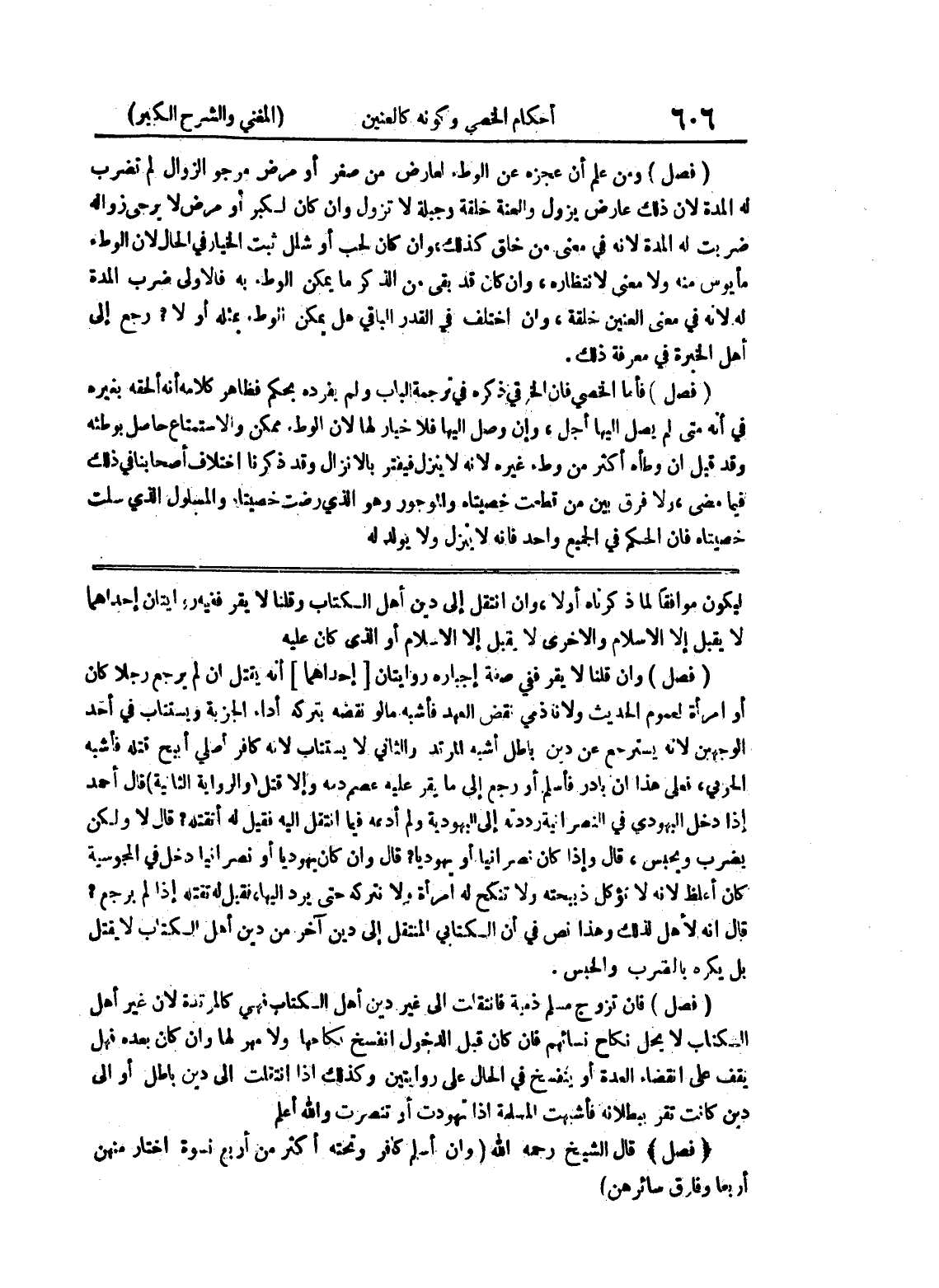 ليكون موافقاً لما ذكرناه أولا، وإن انتقل إلى أهل الكتاب وقلنا لا يقر ففيه روايتان إحداهما لا يقبل إلا الإسلام والأخرى لا يقبل إلا الإسلام أو الذي كان عليه (فصل) وإن قلنا لا يقر ففي صفة إجباره روايتان [إحداهما] أنه يقتل إن لم يرجع رجلا كان أو امرأة لعموم الحديث ولأنه ذمي نقض العهد فأشبه ما لو نقضه بتركه أداء الجزية ويستناب في أحد الوجهين لأنه يسترجع عن دين باطل أشبه المرتد والثاني لا يستتاب لانه كافرا أصلي أبيح قتله فأشبه لحربي، فعلى هذا إن بادر فأسلم أو رجع إلى ما يقر عليه عصم دمه وإلا قتل (والرواية الثانية) قال أحمد إذا دخل اليهودي في النصرانية رددته إلى اليهودية ولم أدعه فيما انتقل إليه فقيل له أتقتله؟ قال لا ولكن يضرب ويحبس، قال وإذا كان نصرانياً أو يهوديا؟ قال وإن كان يهوديا أو نصرانيا دخل في المجوسية كان أعلظ لأنه لا تؤكل ذبيحته ولا تنكح له امرأة ولا نتركه حتى يرد إليها، فقبل له تقتله إذا لم يرجع؟ قال إنه لأهل لذلك وهذا نص في أن الكتابي المنتقل إلى دين آخر من دين أهل الكتاب لا يقتل بل يكره بالضرب والحبس.