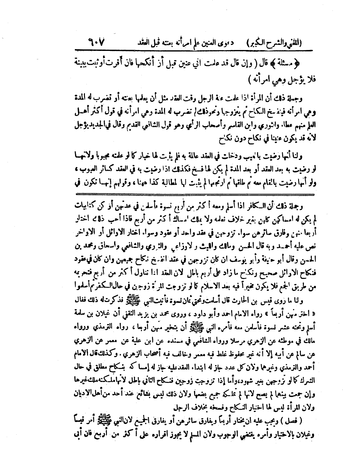 وكذلك قال الامام أحمد والترمذي وغيرهما ولأن كل عدد جاز له ابتداء العقد عليه جاز له إمساكه بنكاح مطلق في حال الشرك كما لو تزجهن بغير شهود، وأما إذا تزوجت زوجين فنكاح الثاني باطل لأنها ملكته ملك غيرها وإن جمعت بينهما لم يصح لأنها لم تملكه جميع بضعها ولأن ذلك ليس بشائع عند أحد من أهل الأديان ولأن المرأة ليس لها اختيار النكاح وفسخه بخلاف الرجل (فصل) ويجب عليه أن يختار أربعاً ويفارق سائرهن أو يفارق الجميع لأن النبي صلى الله عليه وسلم أمر فيسا وغيلان بالاختيار وأمره يقتضي الوجوب ولأن المسلم لا يجوز اقراره على أكثر من أربع فإن أبي