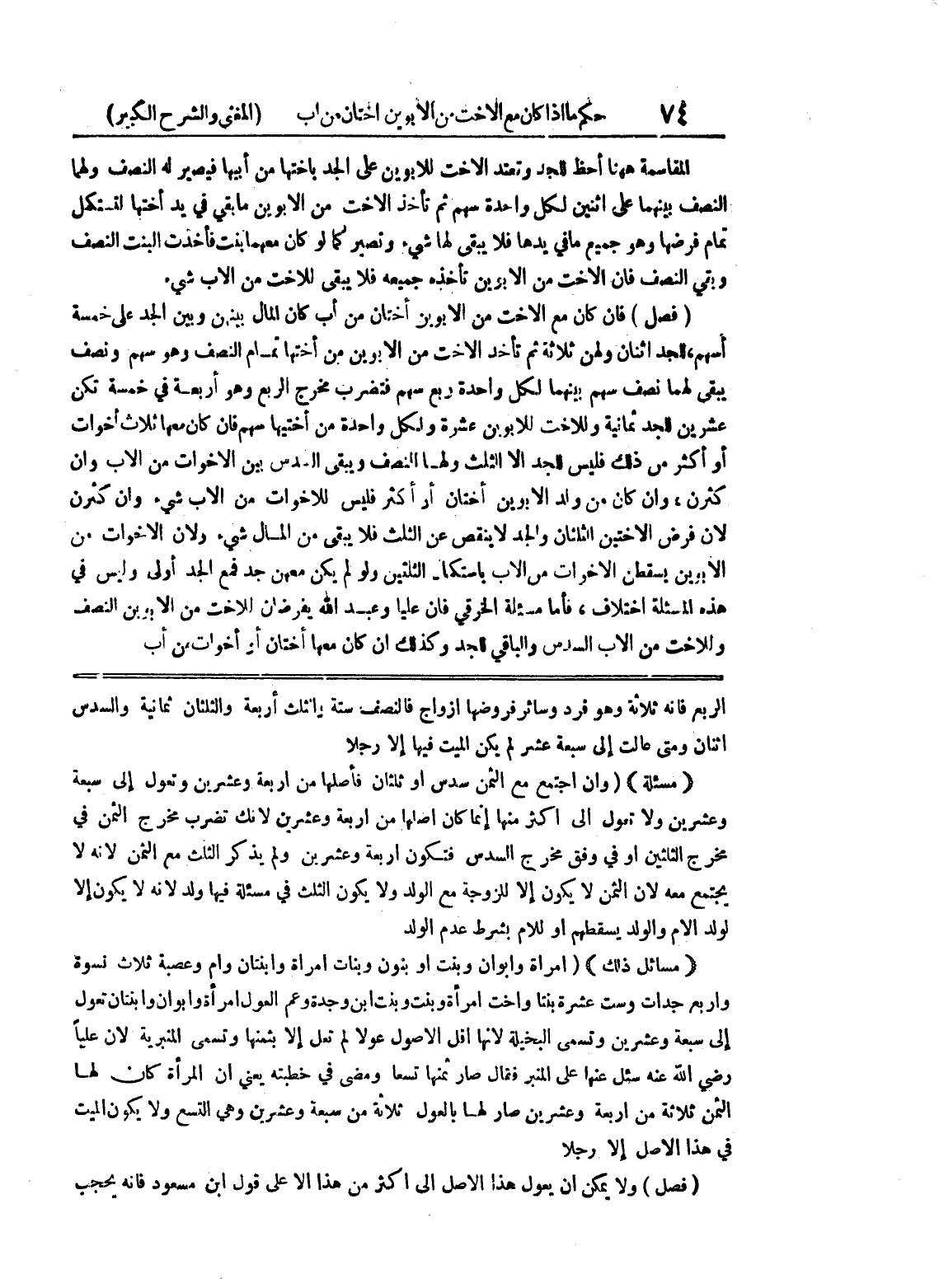 إلى سبعة وعشرين وتسمى البخيلة لأنها أقل الأصول عولاً لم تعل إلا بثمنها وتسمى المنبرية لأن علياً رضي الله عنه سئل عنها على المنبر فقال صار ثمنها تسعا ومضى في خطبته يعني أن المرأة كان لها الثمن ثلاثة من أربعة وعشرين صار لها بالعول ثلاثة من سبعة وعشرين وهي التسع ولا يكون الميت في هذا الأصل إلا رجلاً (فصل) ولا يمكن أن يعول هذا الأصل إلى أكثر من هذا إلا على قول ابن مسعود فإنه يحجب