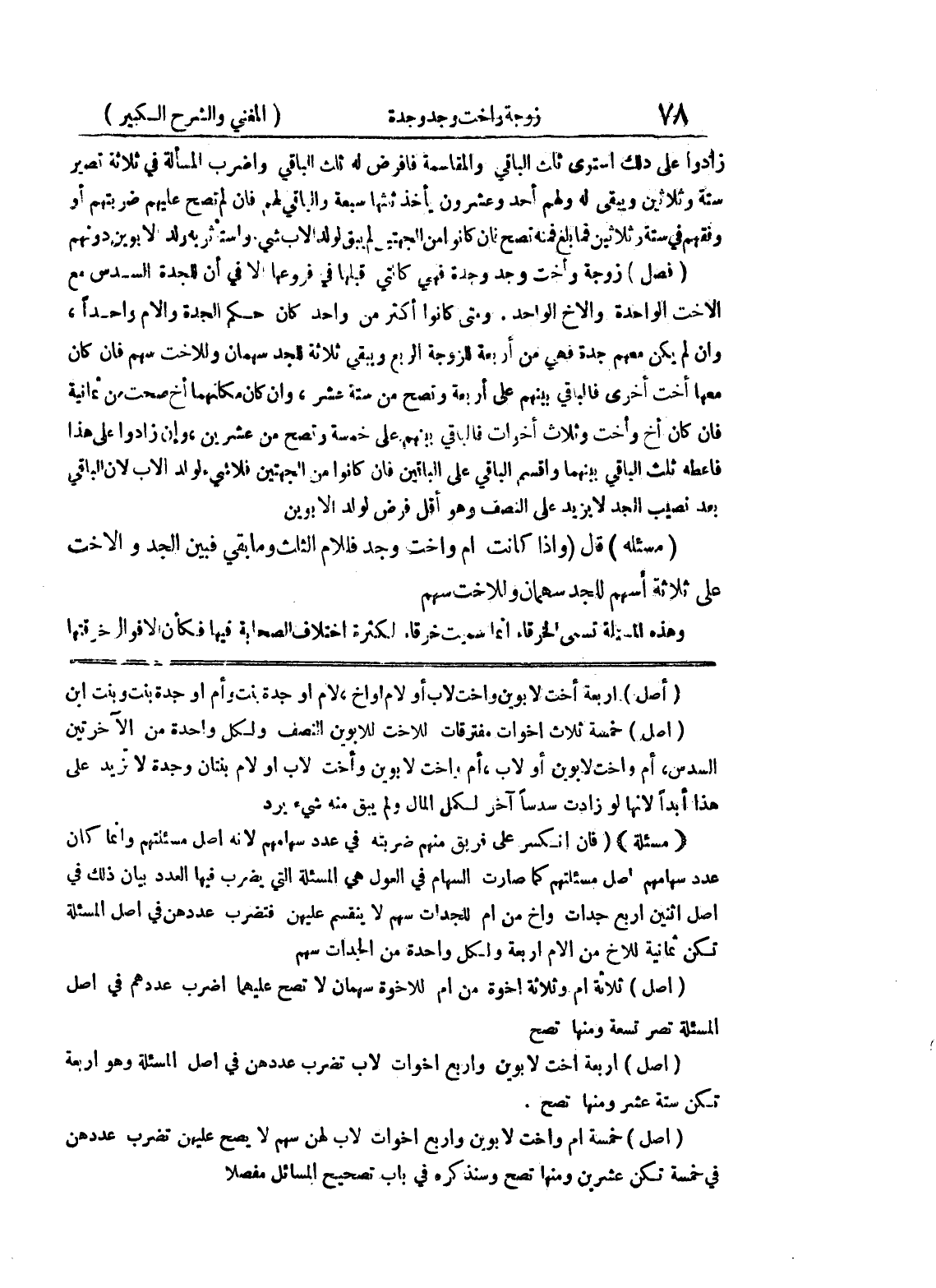 (أصل) أربعة أخت لأبوين وأخت لأب أو لأم أو أخ، لأم أو جدة بنت وأم أو جدة بنت وبنت ابن (أصل) خمسة ثلاث أخوات مفترقات للأخت للأبوين النصف ولكل واحدة من الآخرتين السدس، أم وأخت لأبوين أو لأب، أم وأخت لأبوين وأخت لأب أو لأم بنتان وجدة لا تزيد على هذا أبداً لأنها لو زادت سدساً آخر لكمل المال ولم يبق منه شئ يرد (مسألة) (فإن انكسر على فريق منهم ضربته في عدد سهامهم لأنه اصل مسئلتهم وإنما كان عدد سهامهم اصل مسئلتهم كما صارت السهام في العول هي المسألة التي يضرب فيها العدد بيان ذلك في أصل اثنين أربع جدات وأخ من أم للجدات سهم لا ينقسم عليهن فتضرب عددهن في أصل المسألة تكن ثمانية للأخ من الأم أربعة ولكل واحدة من الجدات سهم (أصل) ثلاثة أم وثلاثة اخوة من أم للأخوة سهمان لا تصح عليهما اضرب عددهم في أصل المسألة تصر تسعة ومنها تصح (أصل) أربعة أخت لأبوين وأربع أخوات لأب تضرب عددهن في أصل المسألة وهو أربعة تكن ستة عشر ومنها تصح.