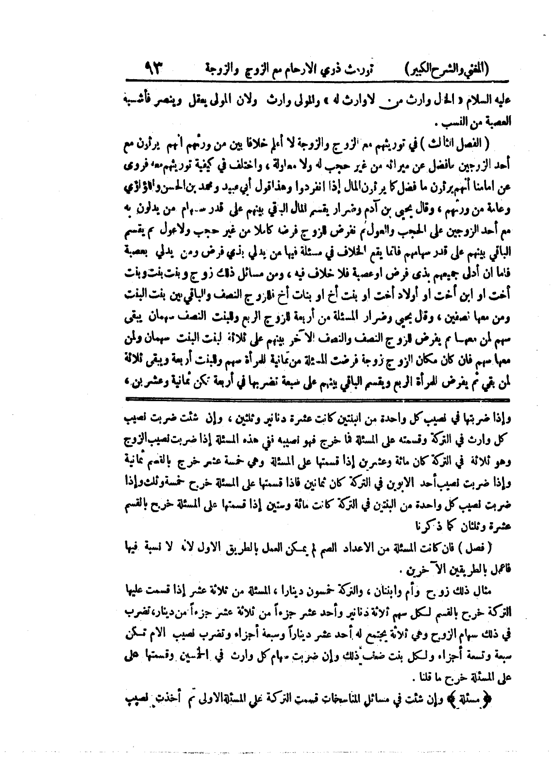 وإذ اضربتها في نصيب كل واحدة من البنتين كانت عشرة دنانير وثلثين، وإن شئت ضربت نصيب كل وارث في التركة وقسمته على المسألة فما خرج فهو نصيبه ففي هذه المسألة إذا ضربت نصيب الزوج وهو ثلاثة في التركة كان مائة وعشرين إذا قسمتها على المسألة وهي خمسة عشر خرج بالقسم ثمانية وإذا ضربت نصيب أحد الأبوين في التركة كان ثمانين فإذا قسمتها على المسألة خرج خمسة وثلث وإذا ضربت نصيب كل واحدة من البنتين في التركة كانت مائة وستين إذا قسمتها على المسألة خرج بالقسم عشرة وثلثان كما ذكرنا (فصل) فإن كانت المسألة من الأعداد الصم لم يمكن العمل بالطريق الأول لأنه لا نسبة فيها فاعمل بالطريقين الآخرين.