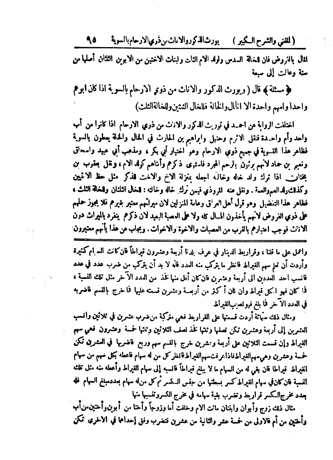 وأردت أن تعلم سهم القيراط فانظر ما يتركب منه العدد فإنه لابد أن يتركب من ضرب عدد في عدد فانسب أحد العددين إلى أربعة وعشرين فإن كان أقل منها فخذ من العدد الآخر مثل تلك النسبة، فما كان فهو لكل قيراط وإن كان أكثر من أربعة وعشرين قسمته عليها فما خرج بالقسم فاضربه في العدد الآخر فما بلغ فهو نصيب القيراط ومثال ذلك ستمائة أردت قسمتها على القراريط فهي متركبة من ضرب عشرين في ثلاثين وانسب العشرين إلى أربعة وعشرين تكن نصفها وثلثها فخذ نصف الثلاثين وثلثها خمسة وعشرون فهي سهم القيراط وإن قسمت الثلاثين على أربعة وعشرين خرج بالقسم سهم وربع فاضربها في العشرين تكن خمسة وعشرين وهي سهم القيراط فإذا عرفت سهم القيراط فانظر كل من له سهام فأعطه بكل سهم من سهام القيراط قيراطاً فإن بقي له من السهام ما لا يبلغ قيراطاً فانسبه إلى سهام القيراط وأعطه منه مثل تلك النسبة فان كان في سهام القيراط كسر بسطتها من جنس الكسر ثم كل من له سهام بعدد مبلغ السهام فله بعدد مخرج الكسر قراريط وتضرب بقية سهامه في مخرج الكسر وتنسبها منها مثال ذلك زوج وأبوان وابنتان ماتت الأم وخلفت أما وزوجاً وأختاً من أبوين وأختين من أب وأختين من أم فالأولى من خمسة عشر والثانية من عشرين فتضرب وفق إحداهما في الأخرى تكن