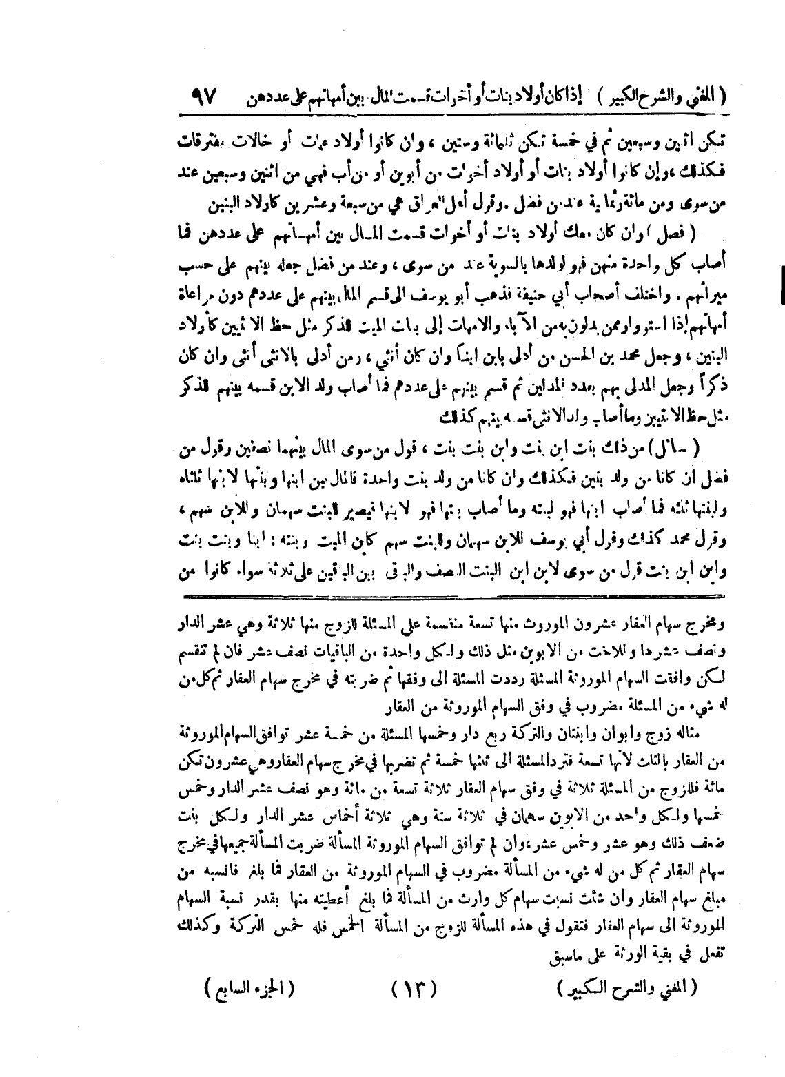 ومخرج سهام العقار عشرون الموروث منها تسعة منقسمة على المسألة للزوج منها ثلاثة وهي عشر الدار ونصف عشرها وللأخت من الأبوين مثل ذلك ولكل واحدة من الباقيات نصف عشر فإن لم تنقسم لكن وافقت السهام الموروثة المسألة رددت المسألة إلى وفقها ثم ضربته في مخرج سهام العقار ثم كل من له شئ من المسألة مضروب في وفق السهام الموروثة من العقار مثاله زوج وأبوان وابنتان والتركة ربع دار وخسمها المسألة من خسمة عشر توافق السهام الموروثة من العقار بالثلث لأنها تسعة فترد المسألة إلى ثلثها خمسة ثم تضربها في مخرج سهام العقار وهي عشرون تكن مائة فللزوج من المسألة ثلاثة في وفق سهام العقار ثلاثة تسعة من مائة وهو نصف عشر الدار وخمس خمسها ولكل واحد من الأبوين سهمان في ثلاثة سنة وهي ثلاثة أخماس عشر الدار ولكل بنت ضعف ذلك وهو عشر وخمس عشر، وإن لم توافق السهام الموروثة المسألة ضربت المسألة جميعها في مخرج سهام العقار ثم كل من له شئ من المسألة مضروب في السهام الموروثة من العقار فما بلغ فانسبه من مبلغ سهام العقار وإن شئت نسبت سهام كل وارث من المسألة فما بلغ أعطيته منها بقدر نسبة السهام الموروثة إلى سهام العقار فتقول في هذه المسألة للزوج من المسألة الخمس فله خمس التركة وكذلك تفعل في بقية الورثة على ما سبق