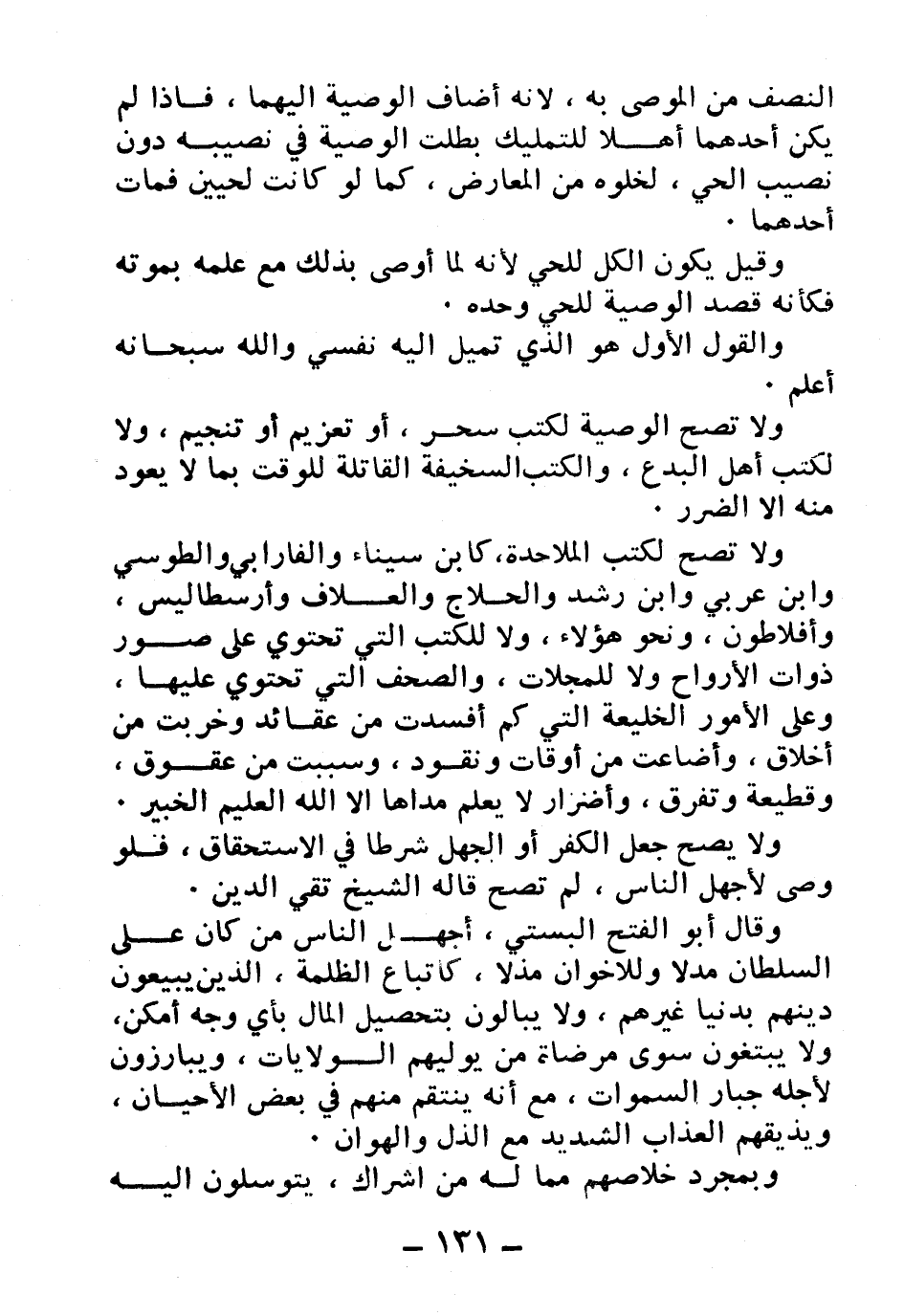 ولا تصح لكتب الملاحدة كابن سيناء والفارابي والطوسي وابن عربي وابن رشد والحلاج والعلاف وأرسطاليس، وأفلاطون، ونحو هؤلاء، ولا للكتب التي تحتوي على صور ذوات الأوراح ولا للمجلات، والصحف التي تحتوي عليها، وعلى الأمور الخليعة التي كم أفسدت من عقائد وخربت من أخلاق، وأضاعت من أوقات ونقود، وسببت من عقوق، وقطيعة وتفرق، وأضرار لا يعلم مداها إلا الله العليم الخبير.
