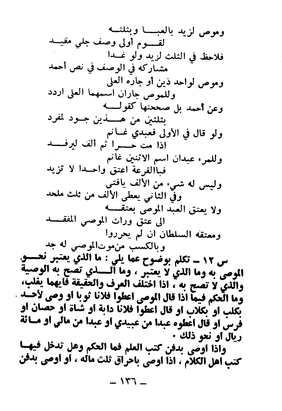س13: تكلم بوضوح عما يلي: ما الذي يعتبر نحو الموصى به؟ وما الذي لا يعتبر؟ وما الذي تصح به الوصية والذي لا تصح به؟ إذا اختف العرف والحقيقة فأيهما يغلب؟ وما الحكم فيما إذا قال الموصى أعطوا فلانًا ثوبًا أو وصى لأحد بكلب أو بكلاب أو قال: أعطوا فلانًا دابة أو شاة أو حصان أو فرس، أو قال: أعطوه عبدًا من عبيدي أو عبدًا من مالي أو مائة ريال أو نحو ذلك.