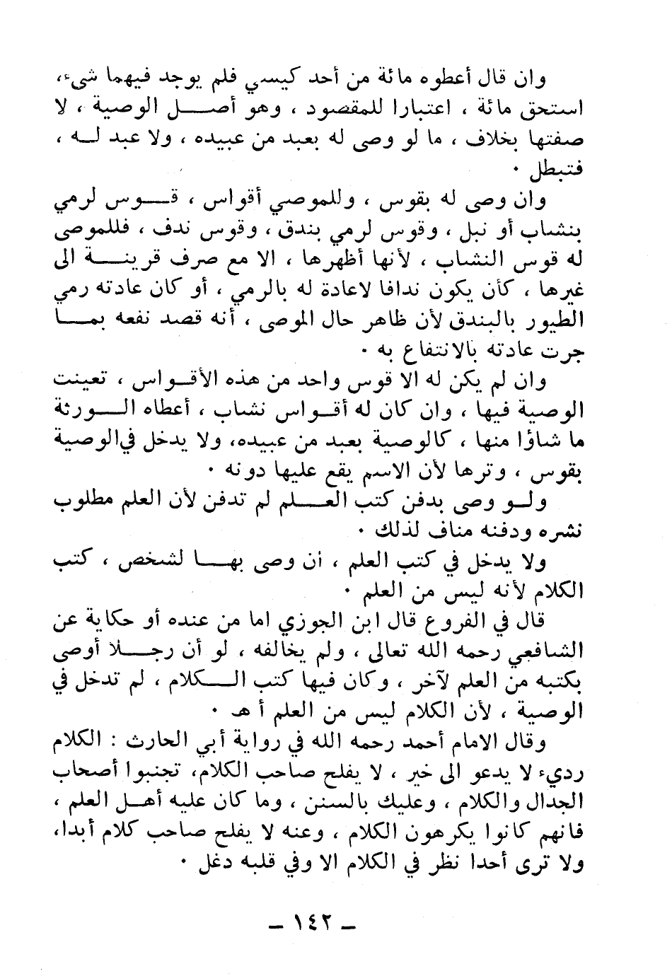قال في «الفروع» : قال ابن الجوزي: أما من عنده أو حكاية عن الشافعي - رحمه الله تعالى - ولم يخالفه، لو أن رجلاً أوصى بكتبه من العلم لآخر، وكان فيها كتب الكلام، لم تدخل في الوصية؛ لأن الكلام ليس من العلم. اهـ.