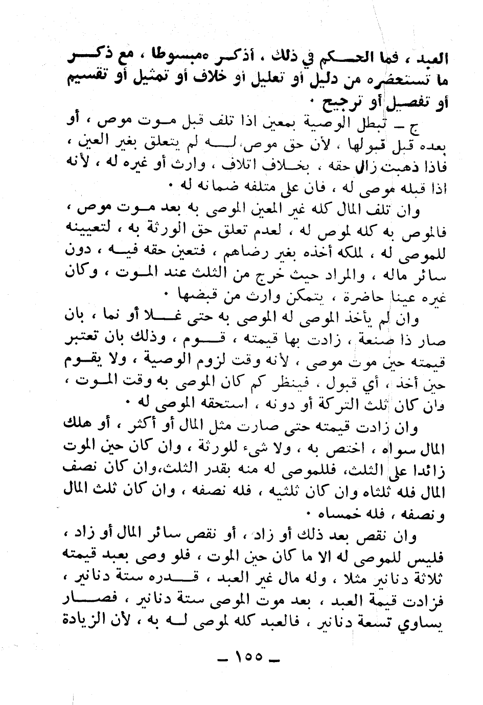 وإن نقص بعد ذلك أو زاد، أو نقص سائر المال أو زاد، فليس للموصى له إلا ما كان حين الموت، فلو وصى بعبد قيمته ثلاثة دنانير مثلاً، وله مال غير العبد، قدره ستة دنانير، فزادت قيمة العبد، بعد موت الموصى ستة دنانير، فصار يساوي تسعة دنانير، فالعبد كله لموصى له به؛ لأن الزيادة
