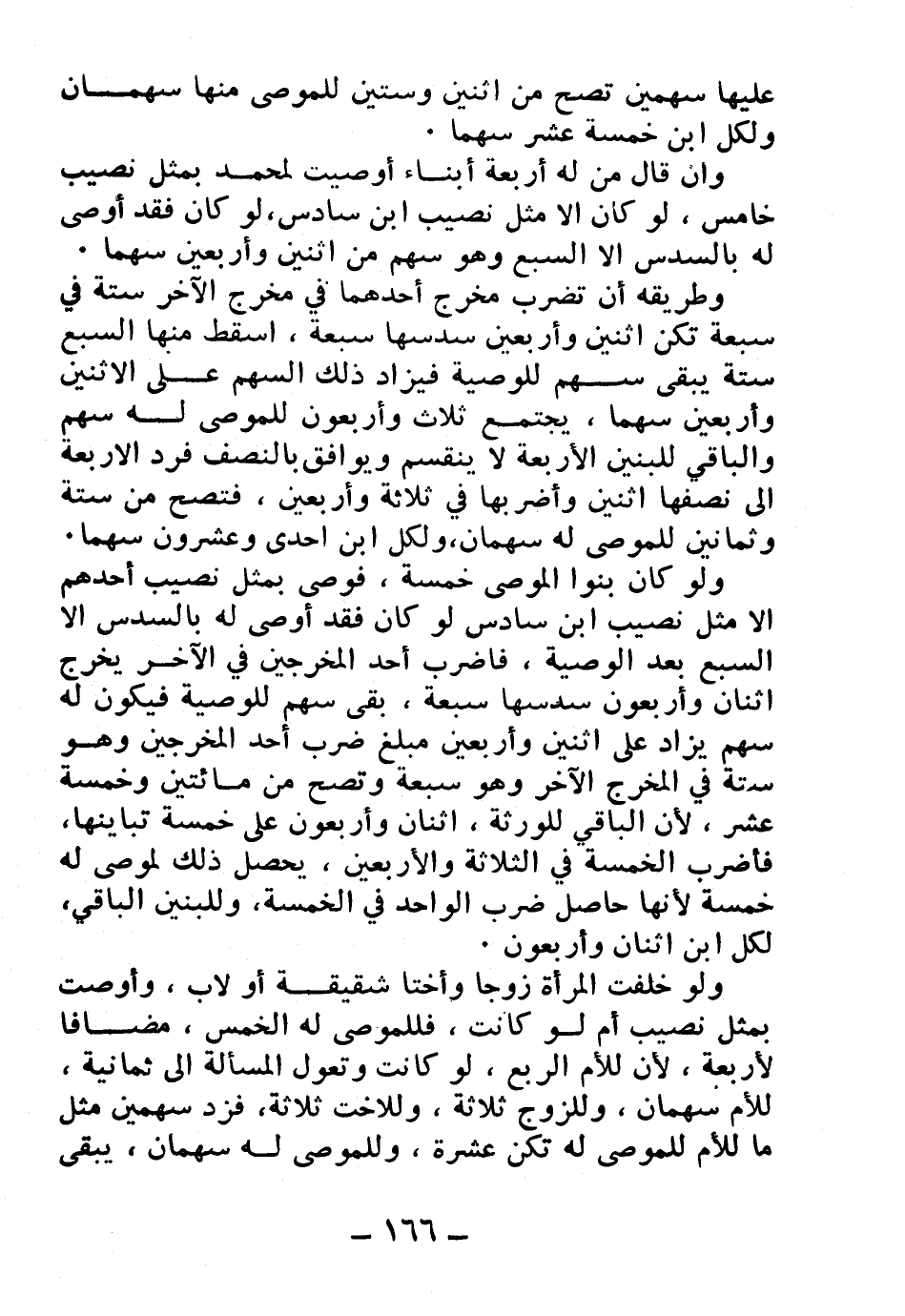 وطريقه أن تضرب مخرج أحدهما في مخرج الآخر ستة في سبعة تكن اثنين وأربعين سدسها سبعة، أسقط منها السبع سبعة تكن اثنين وأربعين سدسها سبعة، أسقط منها السبع ستة يبقى سهم للوصية فيزاد ذلك السهم على الاثنين وأربعين سهمًا، يجتمع ثلاث وأربعون للموصى له سهم والباقي للبنين الأربعة لا ينقسم ويوافق بالنصف فرد الأربعة إلى نصفها اثنين وأضربها في ثلاثة وأربعين، فتصح من ستة وثمانين للموصى له سهمان، ولكل ابن إحدى وعشرون سهمًا.