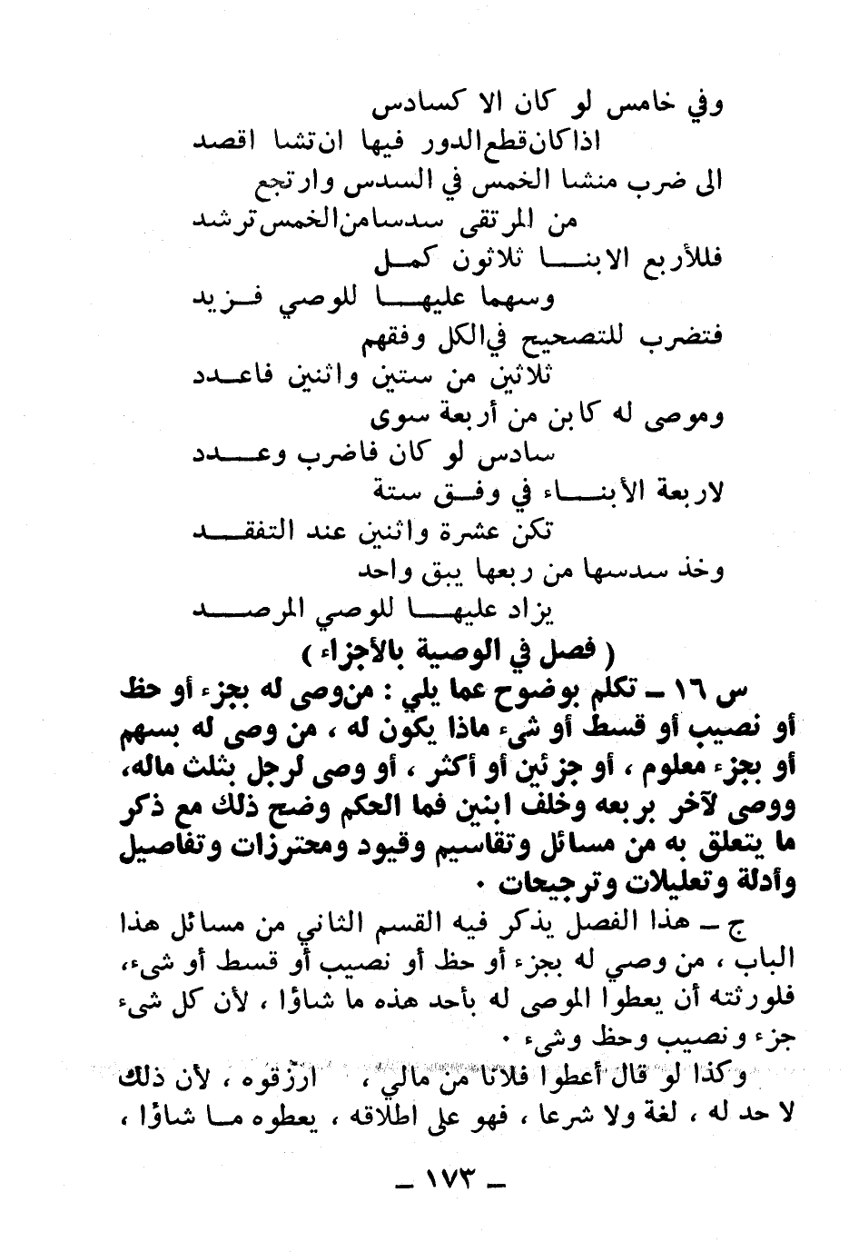 ج: هذا الفصل يذكر فيه القسم الثاني من مسائل هذا الباب، من وصى له بجزء أو حظ أو نصيب أو قسط أو شيء، فلورثته أن يعطوا الموصى له بأحد هذه ما شاءوا؛ لأن كل شيء جزء ونصيب وحظ وشيء.