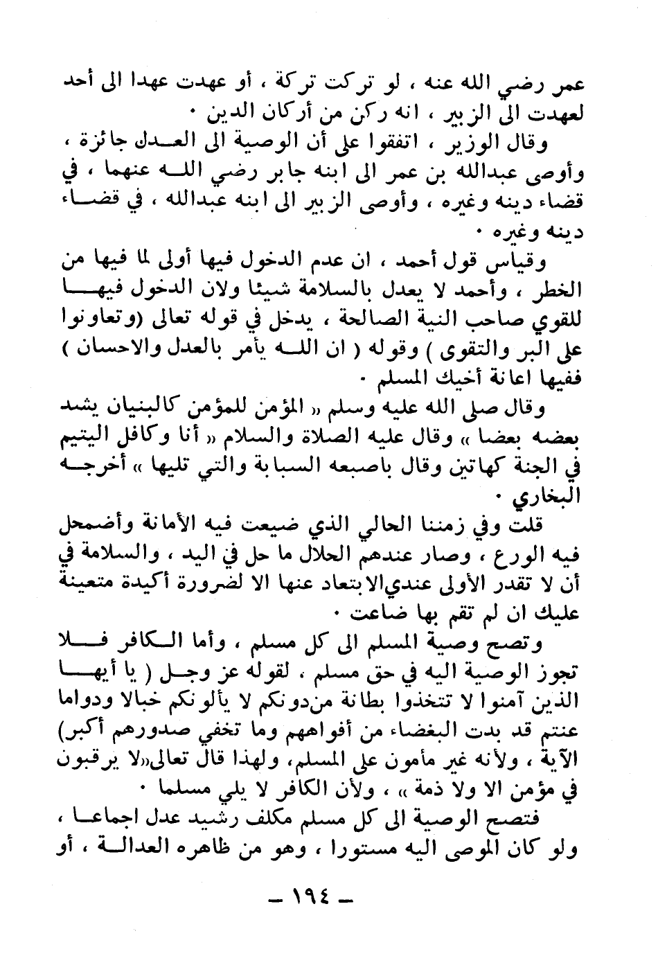 وقال الوزير: اتفقوا على أن الوصية إلى العدل جائزة، وأوصى عبد الله بن عمر إلى ابنه جابر - رضي الله عنهما - في قضاء دينه وغيره، وأوصى الزبير إلى ابنه عبد الله في قضاء دينه وغيره.