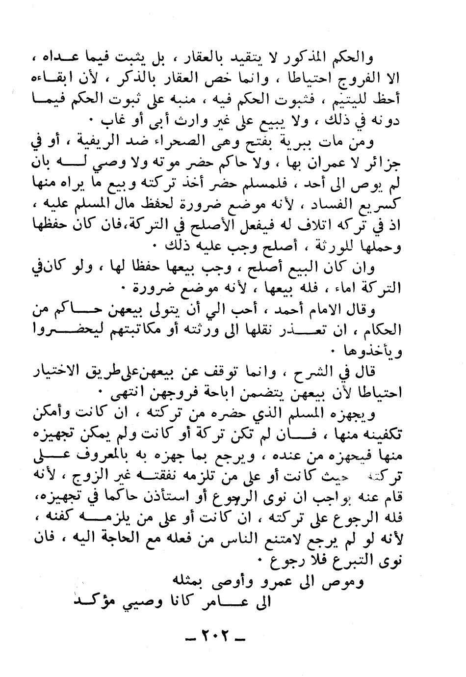 الحكم المذكور لا يتقيد بالعقار، بل يثبت فيما عداه، إلا الفروج احتياطًا، وإنما خص العقار بالذكر؛ لأن إبقاءه أحظ لليتيم، فثبوت الحكم فيه، منبه على ثبوت الحكم فيما دونه في ذلك، ولا يبيع على غير وارث أبى أو غاب.