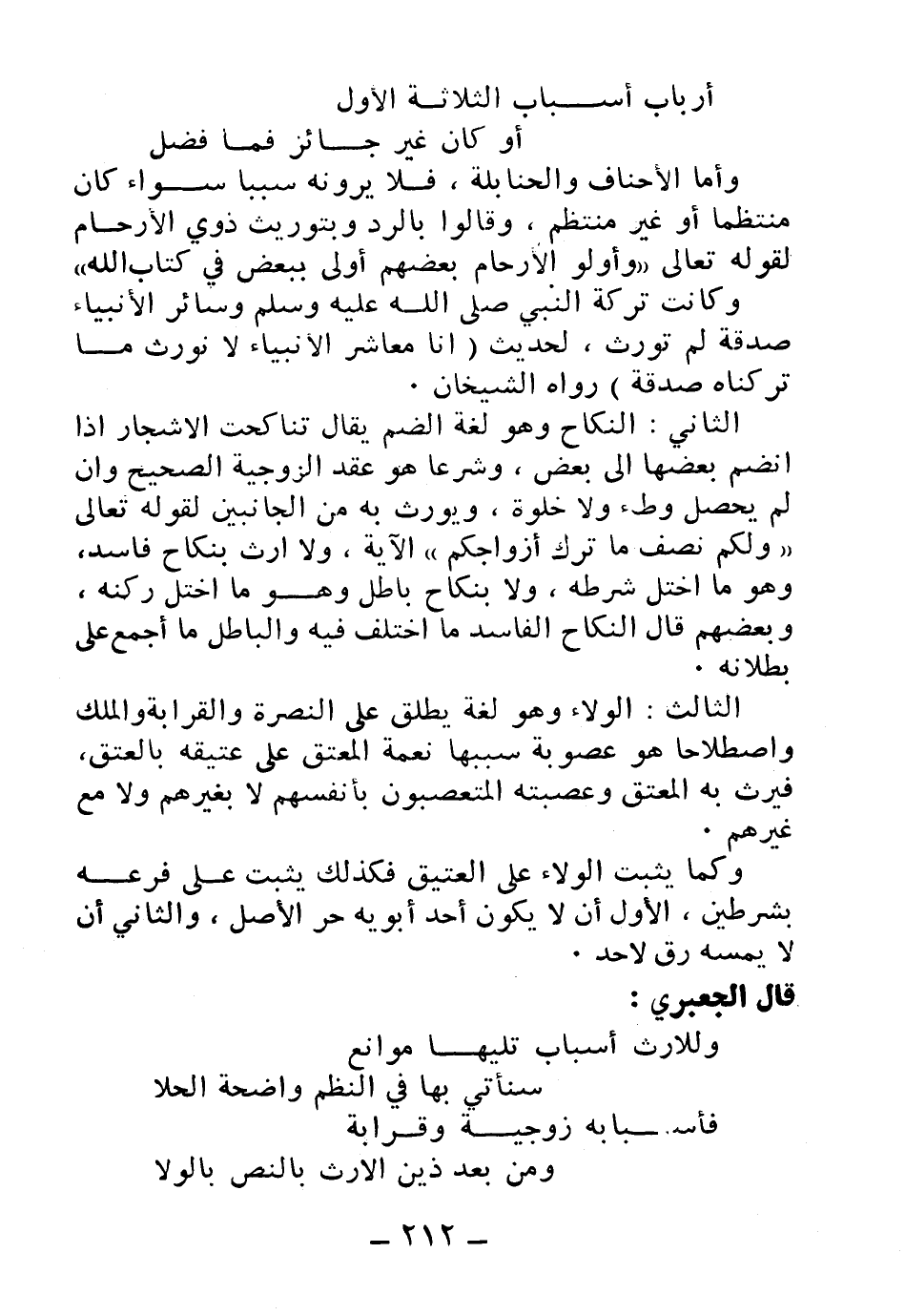 الثاني: النكاح وهو لغة الضم يقال تناكحت الأشجار إذا انضم بعضها إلى بعض، وشرعًا هو عقد الزوجية الصحيح وإن لم يحصل وطء ولا خلوة، ويورث به من الجانبين لقوله - سبحانه وتعالى - {وَلَكُمْ نِصْفُ مَا تَرَكَ أَزْوَاجُكُمْ} الآية، ولا إرث بنكاح فاسد، وهو ما اختل شرطه، ولا بنكاح باطل وهو ما اختل ركنه، وبعضهم قال النكاح الفاسد ما اختلف فيه والباطل ما أجمع على بطلانه.