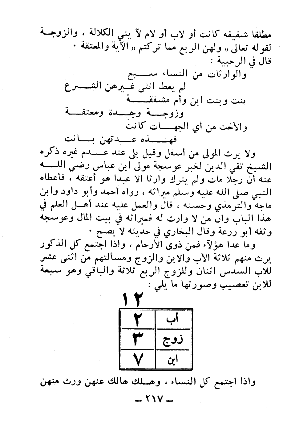 وما عدا هؤلاء فمن ذوي الأرحام، وإذا اجتمع كل الذكور يرث منهم ثلاثة الأب والابن والزوج ومسألتهم من اثني عشر للأب السدس اثنان وللزوج الربع ثلاثة والباقي وهو سبعة للابن تعصيب وصورتها ما يلي: