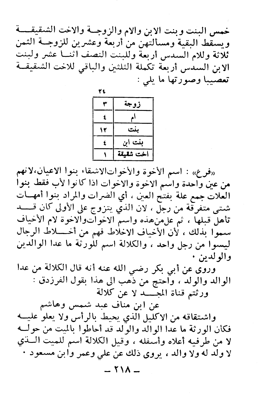 البقية ومسألتهن من أربعة وعشرين للزوجة الثمن ثلاثة وللأم السدس أربعة وللبنت النصف اثنا عشر ولبنت الابن السدس أربعة تكملة الثلثين والباقي للأخت الشقيقة تعصيبًا وصورتها ما يلي: