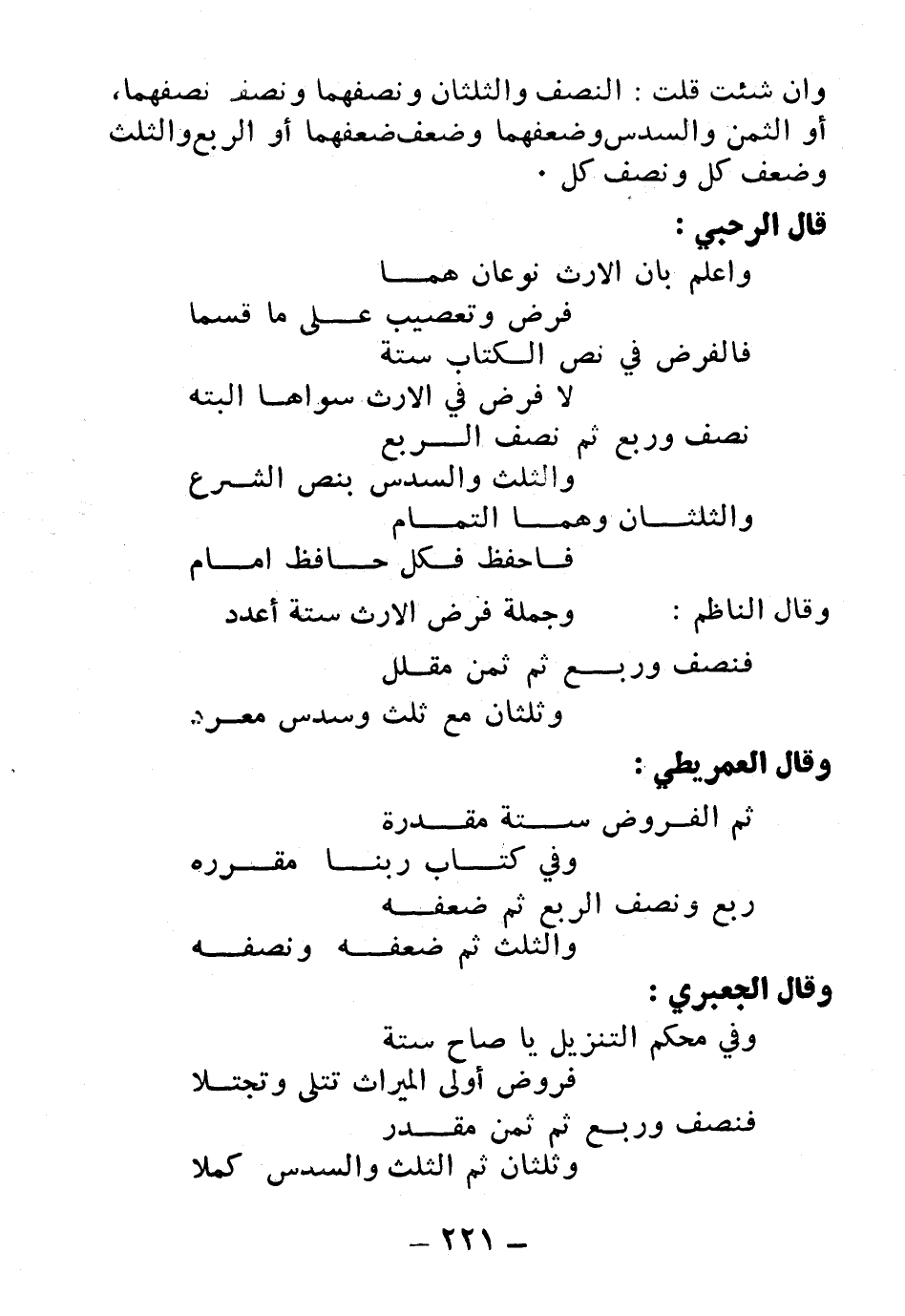 فالفَرضُ في نَصِّ الكِتابِ سِتَّة ... لا فَرْضَ فِي الإرثِ سِواهَا البَتَّهْ