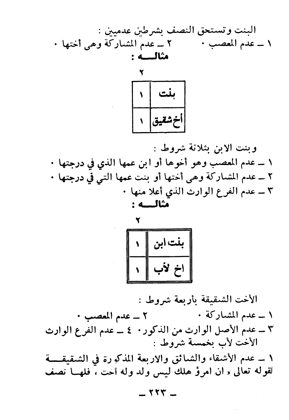 1- عدم الأشقاء والشائق والأربعة المذكورة في الشقيقة لقوله تعالى: {إِنْ امْرُؤٌ هَلَكَ لَيْسَ لَهُ وَلَدٌ وَلَهُ أُخْتٌ فَلَهَا نِصْفُ