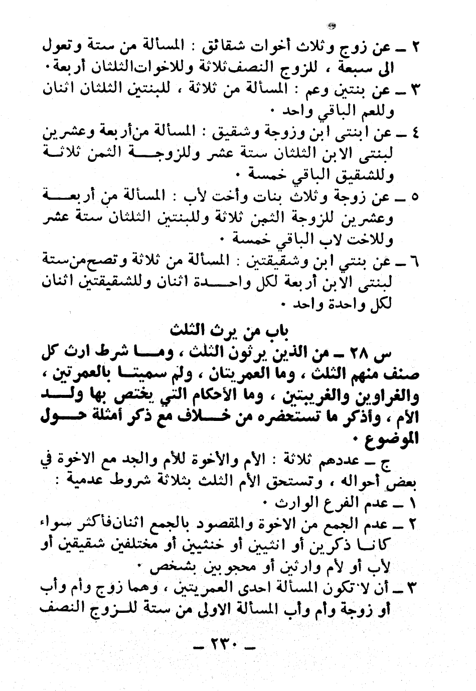 4 - عن ابنتي ابن وزوجة وشقيق: المسألة من أربعة وعشرين لبنتي الابن الثلثان ستة عشر وللزوجة الثمن ثلاثة وللشقيق الباقي خمسة.