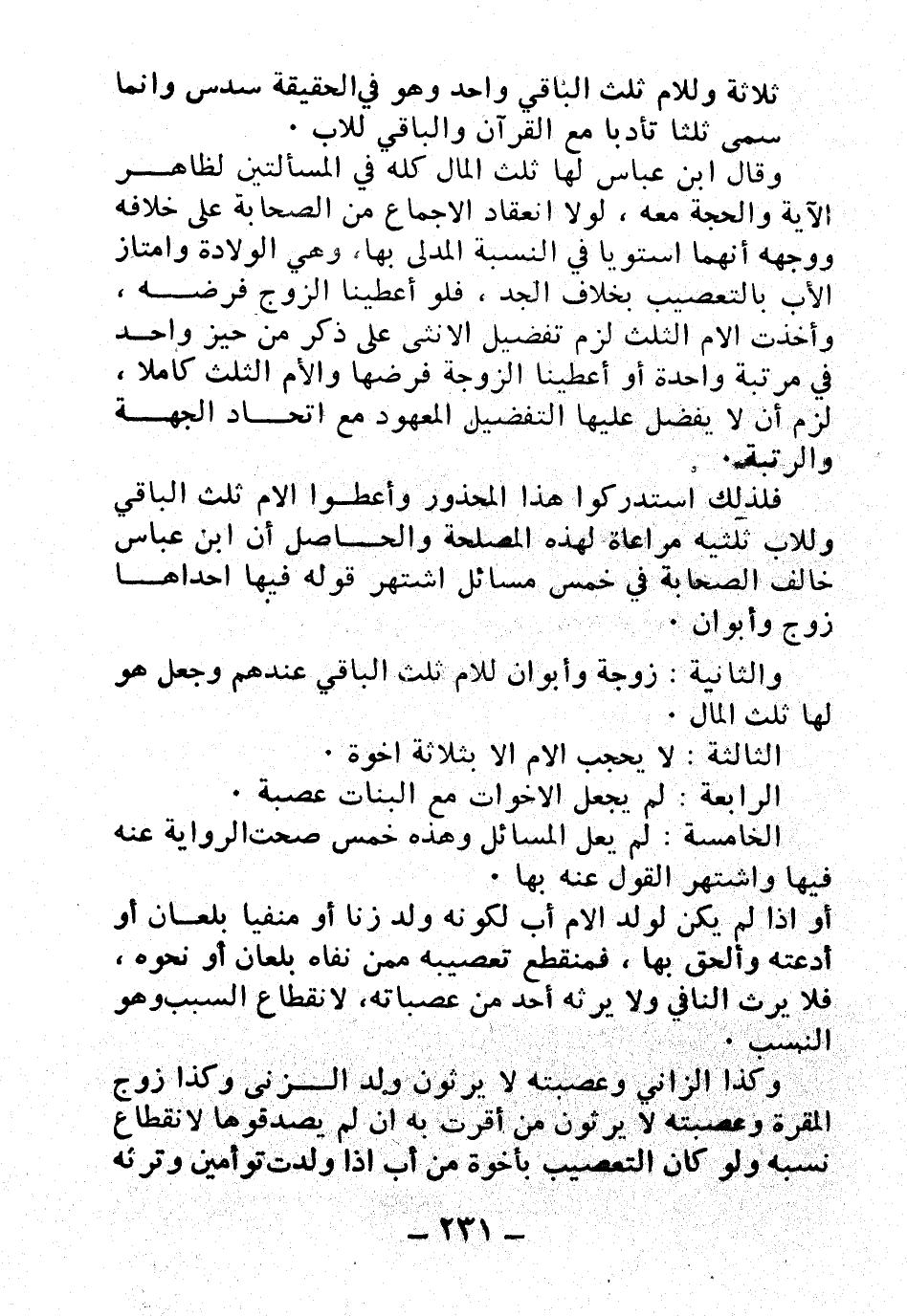 فلذلك استدركوا هذا المحذور وأعطوا الأم ثلاث الباقي وللأب ثلثيه مراعاة لهذه المصلحة والحاصل أن ابن عباس خالف الصحابة في خمس مسائل اشتهر قوله فيها إحداها زود وأبوان.