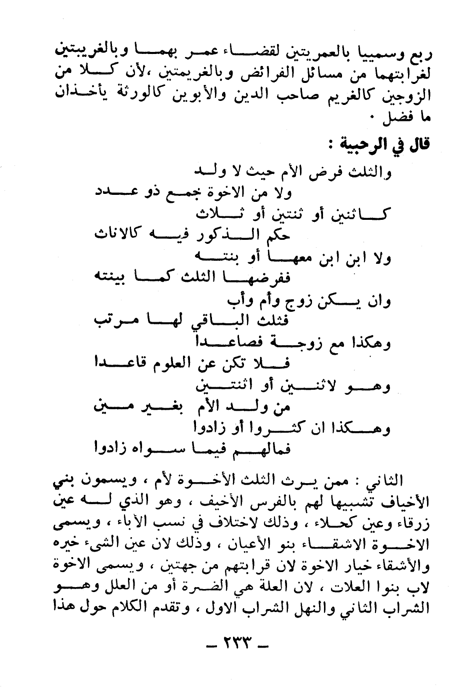 والثُّلْثُ فرضُ الأُمِّ حيثُ لا وَلَد ... ولا مِنَ الإخوَةِ جمعٌ ذُو عدَد