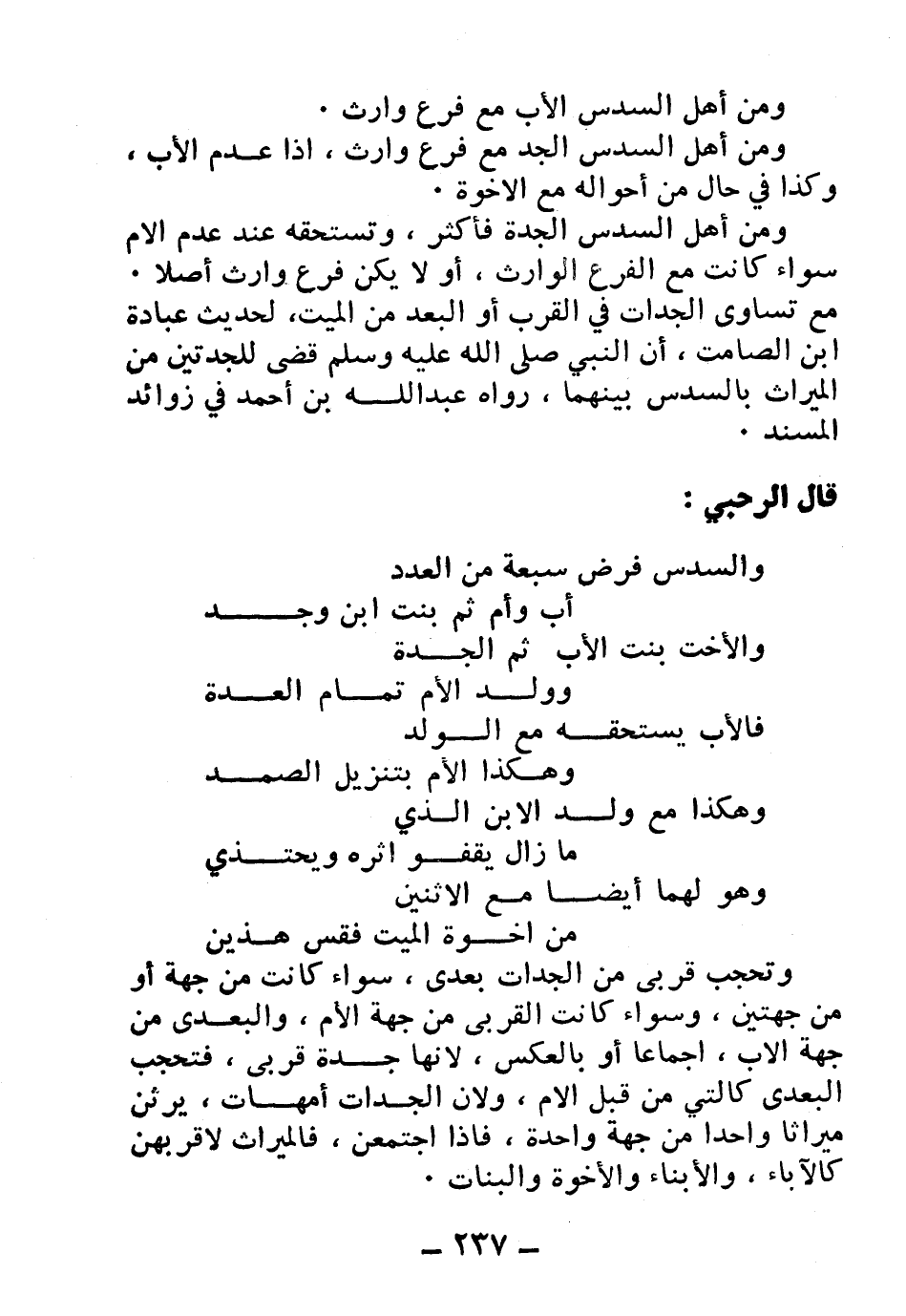ومن أهل السدس الجدة فأكثر، وتستحقه عند عدم الأم سواء كانت مع الفرع الوارث، أو لا يكن فرع وارث أصلاً. مع تساوي الجدات في القرب أو البعد من الميت، لحديث عبادة ابن الصامت، أن النبي - صلى الله عليه وسلم - قضى للجدتين من الميراث بالسدس بينهما، رواه عبد الله بن أحمد في زوائد المسند.