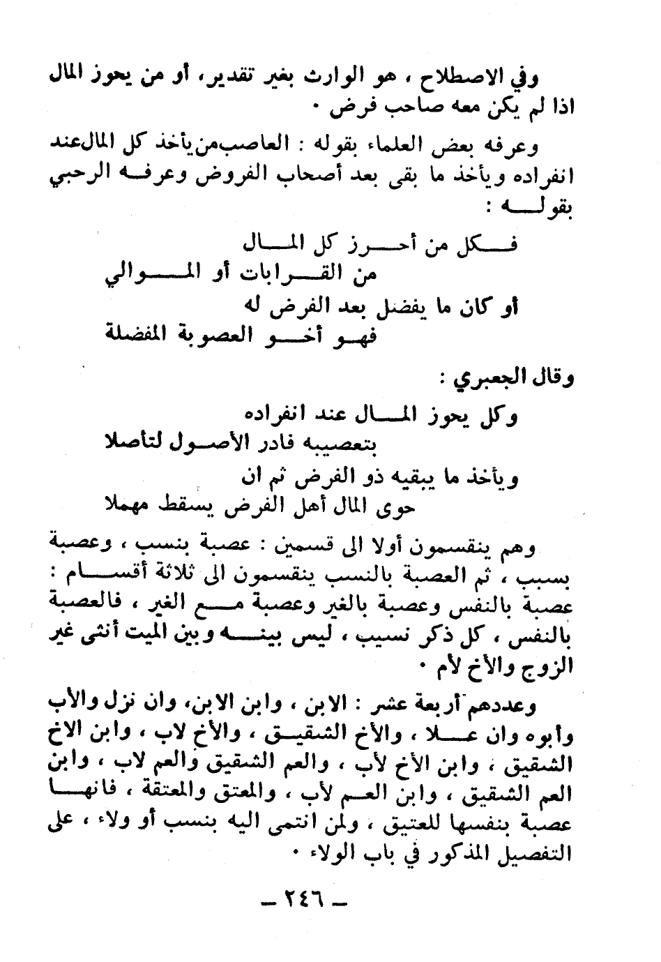 وهم ينقسمون أولا إلى قسمين: عصبة بنسب، وعصبة بسبب، ثم العصبة بالنسب ينقسمون إلى ثلاثة أقسام: عصبة بالنفس وعصبة بالغير وعصبة مع الغير، فالعصبة بالنفس، كل ذكر نسيب، ليس بينه وبين الميت أنثى غير الزوج والأخ لأم.