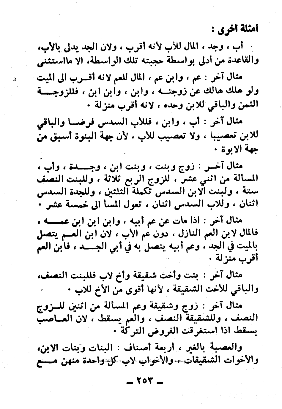 مثال آخر: عم، وابن عم، المال للعم لأنه أقرب إلى الميت ولو هلك هالك عن زوجته، وابن، وابن ابن، فللزوجة الثمن والباقي للابن وحده، لأنه أقرب منزلة.