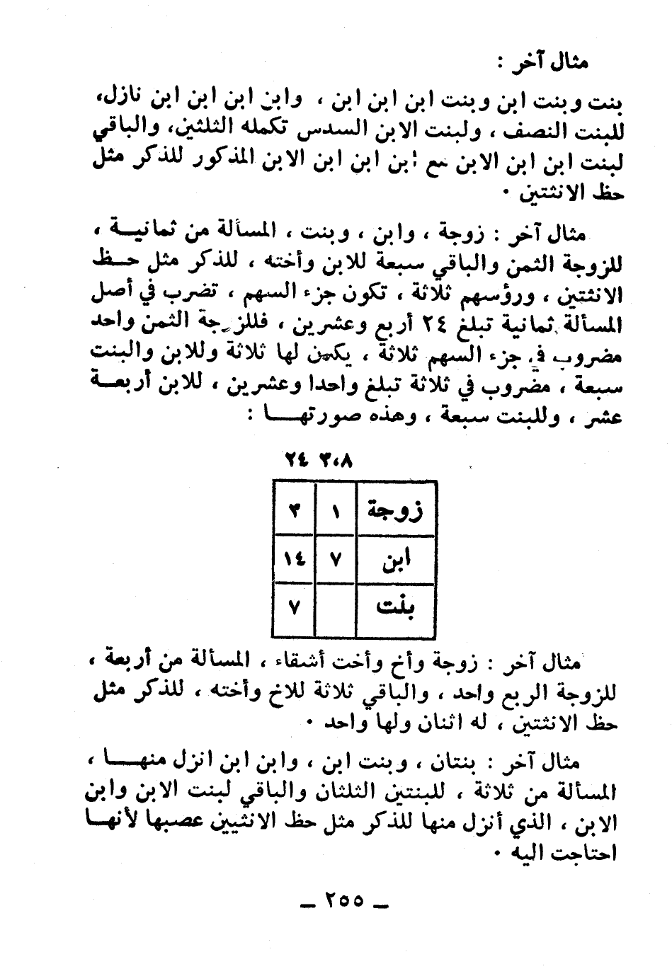 زوجة، وابن، وبنت، المسألة من ثمانية، للزوجة الثمن والباقي سبعة للابن وأخته، للذكر مثل حظ الأنثيين، ورؤسهم ثلاثة، تكون جزء السهم، تضرب في أصل المسألة ثمانية تبلغ 24 أربع وعشرين، فللزوجة الثمن واحد مضروب في جزئ السهم ثلاثة، يكمن لها ثلاثة وللابن والبنت سبعة، مضروب في ثلاثة تبلغ واحدًا وعشرين، للابن أربعة عشر، وللبنت سبعة، وهذه صورتها: