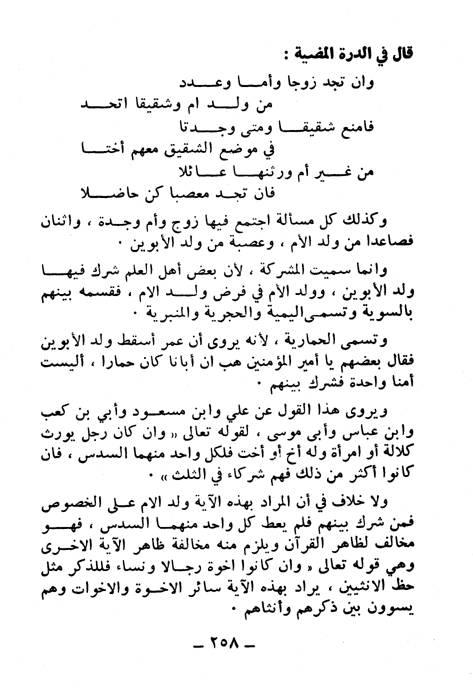 ولا خلاف في أن المراد بهذه الآية ولد الأم على الخصوص فمن شرك بينهم فلم يعط كل واحد منهما السدس، فهو مخالف لظاهر القرآن ويلزم منه مخالفة ظاهر الآية الأخرى وهي قوله - سبحانه وتعالى - {وَإِنْ كَانُوا إِخْوَةً رِجَالاً وَنِسَاءً فَلِلذَّكَرِ مِثْلُ حَظِّ الأُنثَيَيْنِ} ، يراد بهذه الآية سائر الأخوة والأخوات وهم يسوون بين ذكرهم وأنثاهم.