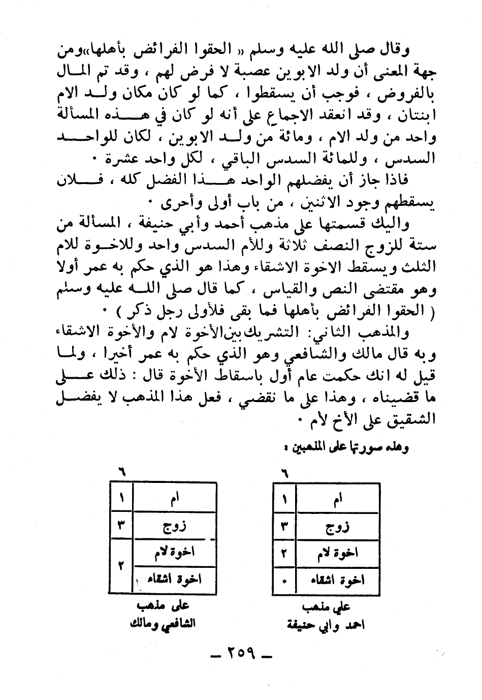 وإليك قيمتها على مذهب أحمد وأبي حنيفة، المسألة من ستة للزوج النصف ثلاثة وللأم السدس واحد وللأخوة للأم الثلث ويسقط الأخوة الأشقاء وهذا هو الذي حكم به عمر أولا وهو مقتضى النص والقياس، كما قال - صلى الله عليه وسلم -: «أَلحقوا الفرائض بِأهلها فما بقي فلأولى رجلٍ ذكرٍ» .