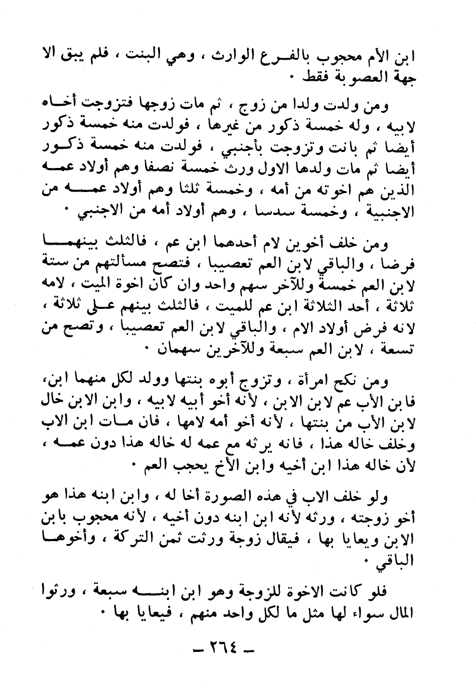 ومن ولدت ولدًا من زوج، ثم مات زوجها فتزوجت أخاه لأبيه، وله خمسة ذكور من غيرها، فولدت منه خمسة ذكور أيضًا ثم مات ولدها الأول ورث خمسة نصفًا وهم أولاد عمه الذين هم أخوته من أمه، وخمسة ثلثا وهم أولاد عمه من الأجنبية، وخمسة سدسًا، وهم أولاد أمه من الأجنبي.