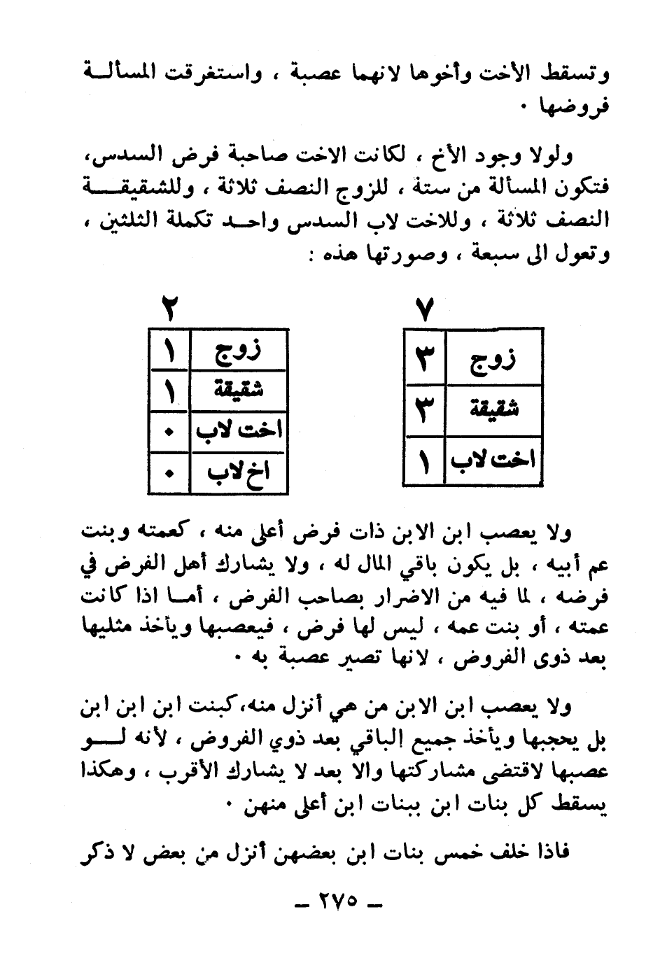 وتسقط الأخت وأخوها لأنهما عصبة، واستغرقت المسألة فروضها ولولا وجود الأخ، لكانت الأخت صاحبة فرض السدس، فتكون المسألة من ستة، للزوج النصف ثلاثة، وللشقيقة النصف ثلاثة، وللأخت لأب السدس واحد تكملة الثلثين، وتعول إلى سبعة، وصورتها هذه: