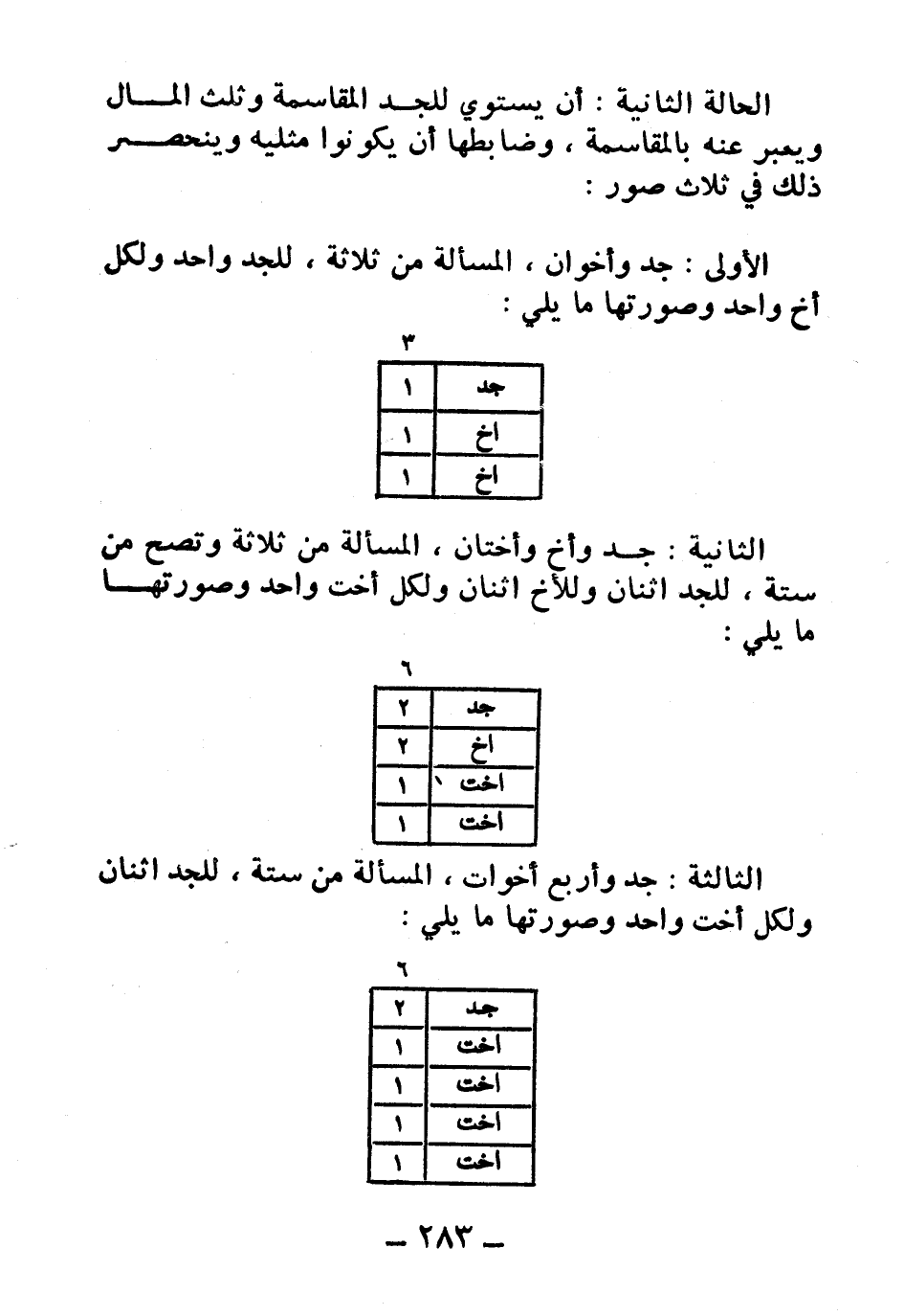 الثانية: جد وأخ وأختان، المسألة من ثلاثة وتصح من ستة، للجد اثنان وللأخ ولكل أخت واحد وصورتها ما يلي: