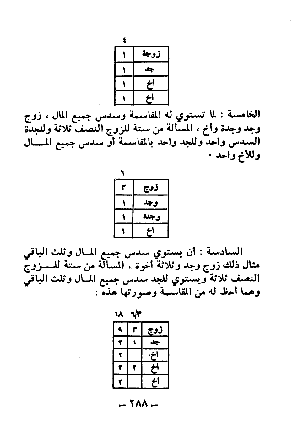 الخامسة: لما تستوي له المقاسمة وسدس جميع المال، زوج وجد وجدة وأخ، المسألة من ستة للزوج النصف ثلاثة وللجدة السدس واحد وللجد واحد بالمقاسمة أو سدس جميع المال وللأخ واحد.