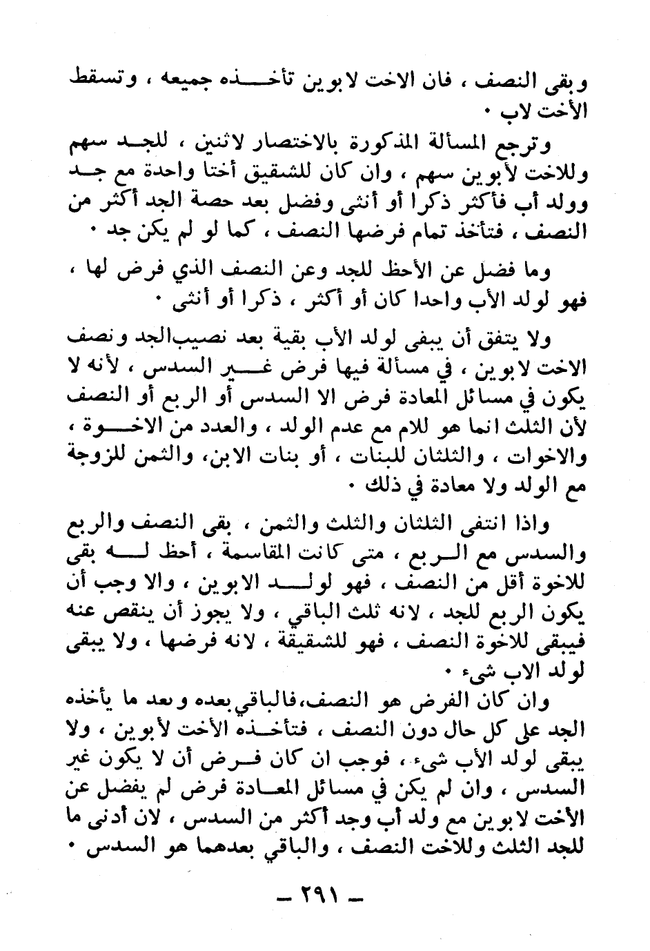 ولا يتفق أن يبقى لولد الأب بقية بعد نصيب الجد ونصف الأخت لأبوين، في مسألة فيها فرض غير السدس، لأنه لا يكون في مسائل المعادة فرض إلا السدس أو الربع أو النصف لأن الثلث إنما هوللأم مع عدم الولد، والعدد من الأخوة، والأخوات، والثلثان للبنات، أو بنات الابن، والثمن للزوجة مع الولد ولا معادة في ذلك.