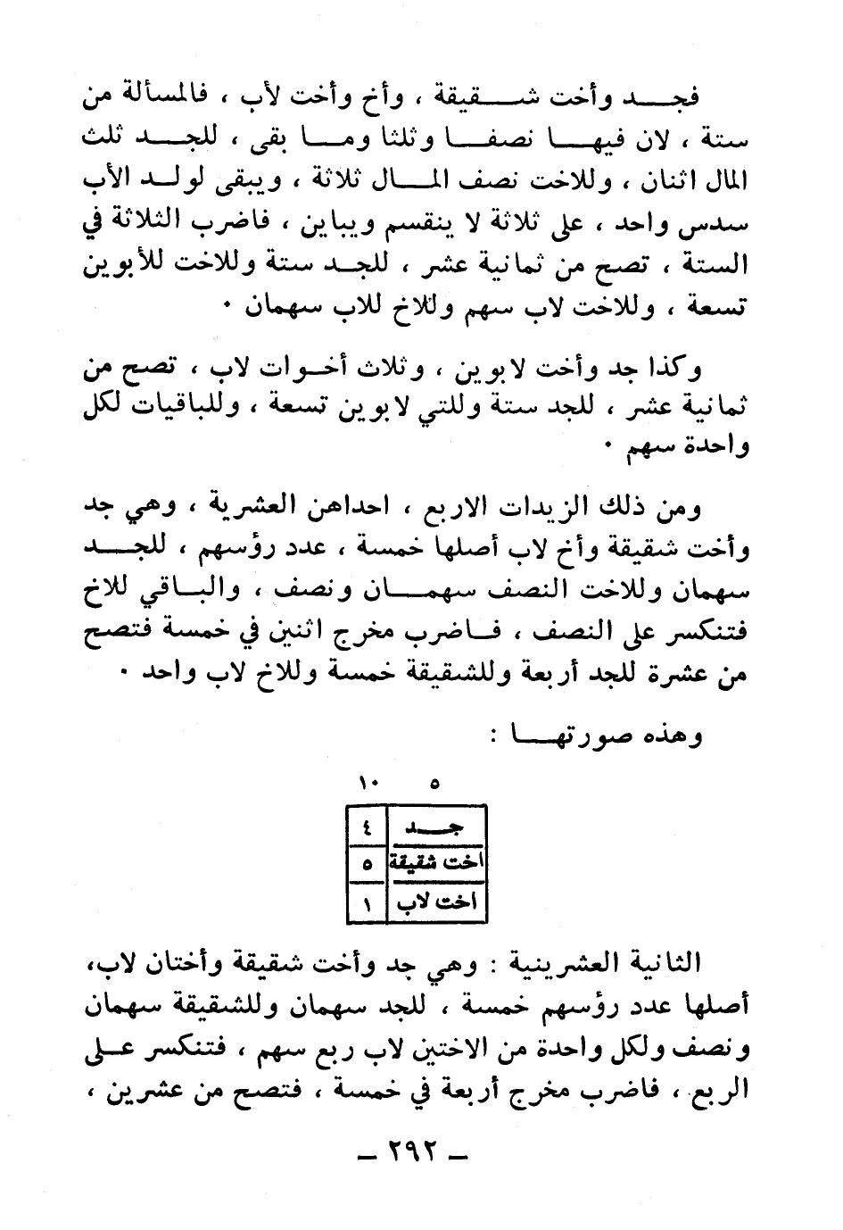 ومن ذلك الزيدات الأربع، إحداهن العشرية، وهي جد وأخت شقيقة وأخ لأب أصلها خمسة، عدد رؤوسهم، للجد سهمان وللأخت النصف سهمان ونصف، والباقي للأخ فتنكسر على النصف، فاضرب مخرج اثنين في خمسة فتصح من عشرة للجد أربعة وللشقيقة خمسة وللأخ لأب واحد.